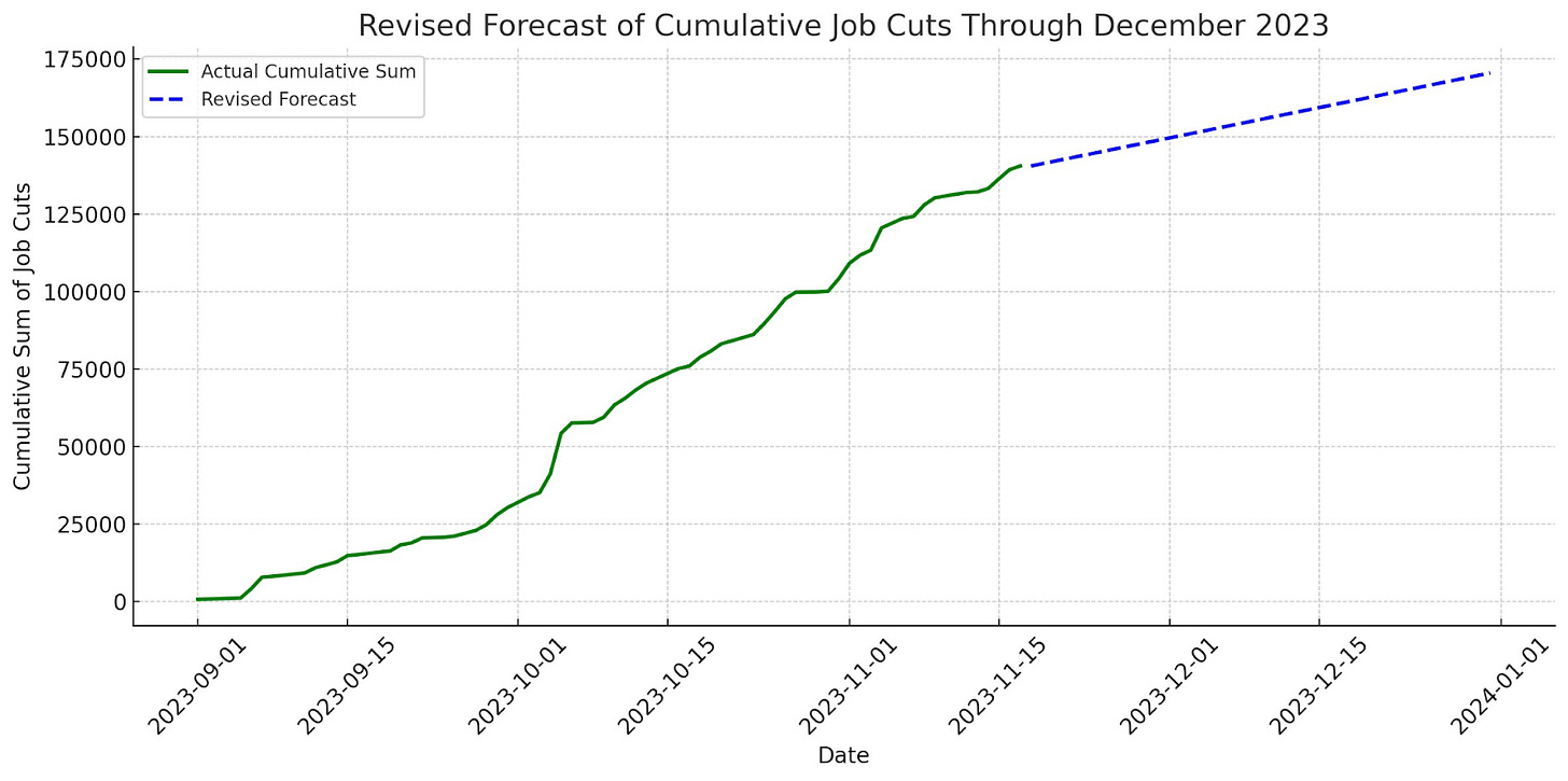 As we progress through November - we’ve continued to see a steady stream of job cut announcements, although the true # of job cuts has been far fewer than in October (more than likely due to the UAW job cut announcements rolling off and the UAW rehiring). I anticipate that we may see some pick up in the # of absolute companies announcing job cuts in December - although I think it would be a stretch to think the # of job cuts will exceed this month's or October’s total: