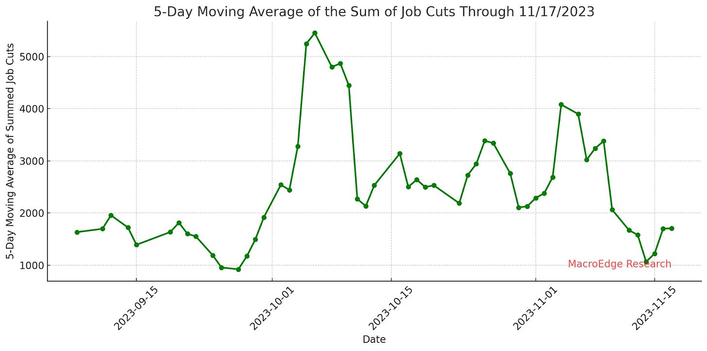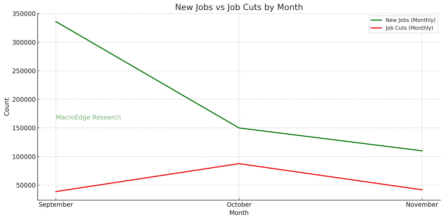 Our warning sign for the labor market would be when job cuts > job growth, this does not remain the case. Note that this figure is utilizing the TEForecast for expected November job adds (110,000), and this figure may be lower or higher. With just 6 workdays left for the month now, we anticipate that job cuts will probably finish somewhere in the 45,000-55,000 come to the final release in early December. Unless job growth comes in below that, there’s still little concern about cuts outpacing growth. Here’s the trend visualized for the last 3 months:
