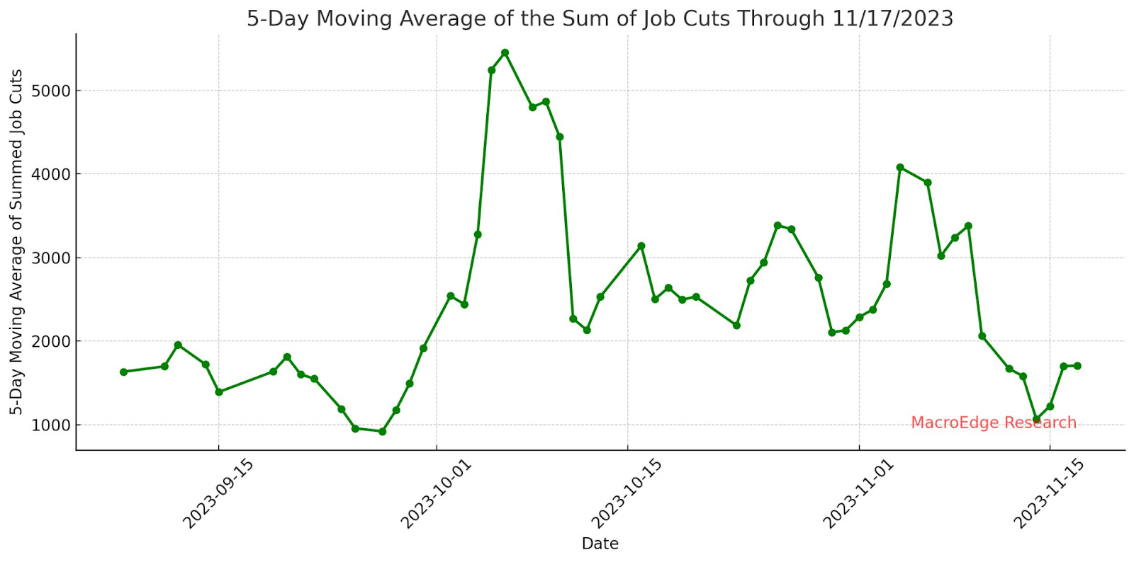 Here is the 5-day moving average of our job cuts tracker. Note the sharp drop in job cuts towards the end of the month. The story of the market continues to be one of a ‘soft landing’ regarding the labor market. Investors are still more than confident that the Fed will continue to be able to see a lack of job cuts that keep the economy at maximum employment… Here’s the current forecasted trend for job cuts through December: