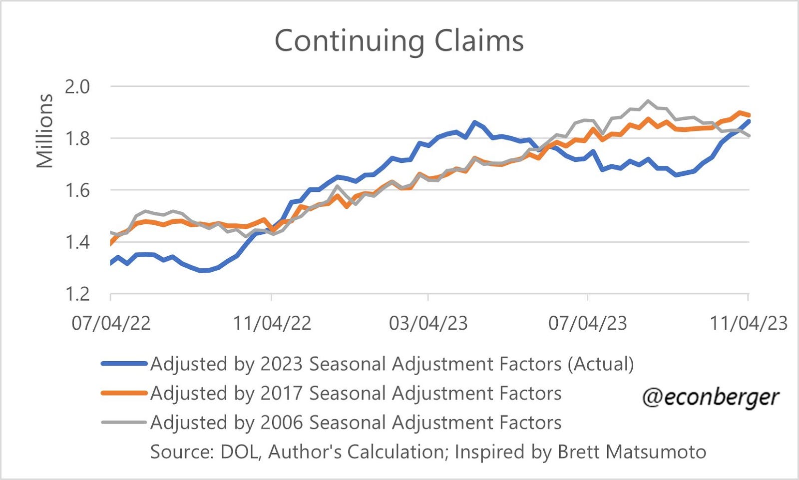 What’s fascinating about the BLS figure is that using the same methodology regarding seasonal adjustments from the pre-GFC era, claims would be trending downward, instead of their current upward trend.