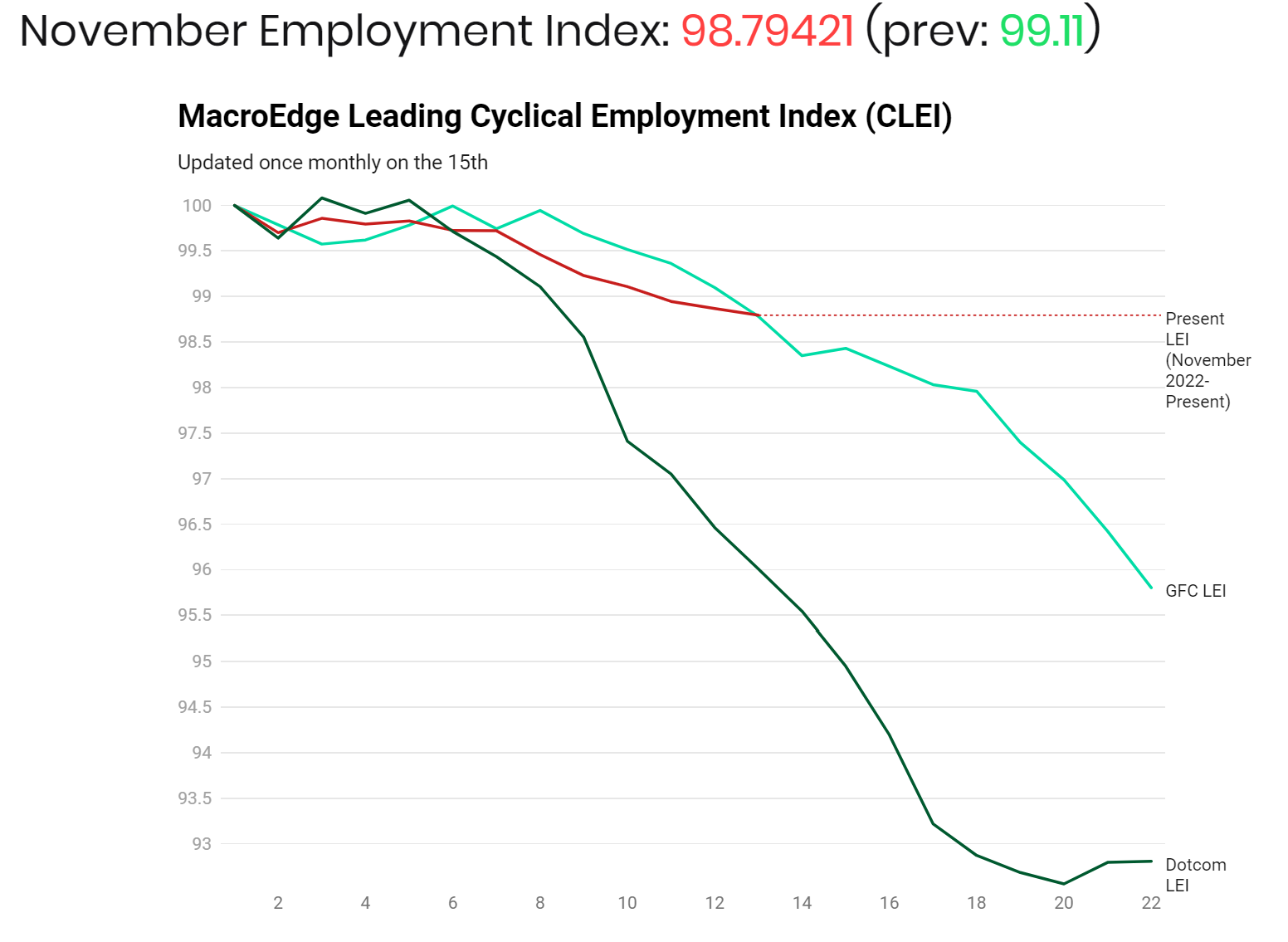 Our Leading Employment Index saw a slight decrease to 98.79421 (100=month 1 from inversion of the 10 year / 3 month curve) signalling contraction of our 7 basket weighted average leading cyclical employment sectors. This reading was skewed by negative revisions made for the September and October - the majority of the basket actually saw expansion in total employment in November.