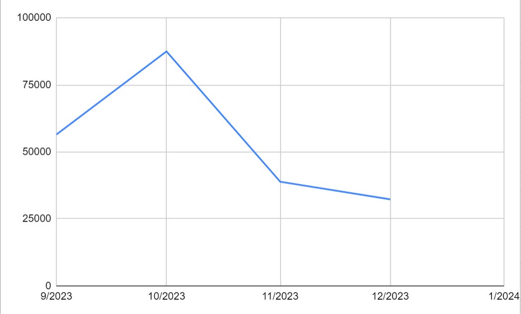 Total job cuts have slowed dramatically since the peak in October when the large Citibank job cuts were announced - and I think it’s reasonable to expect a pickup in job cuts sometime before the Q1 earnings bonanza that will give us eyes and ears into holiday sale performances from all the major players. Here’s the trend in job cuts since we began tracking this series on our website: