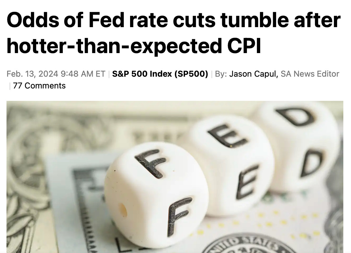 On Wall Street, speculation ran rapid since November 2023, with pundits proclaiming victory on the inflation war and advocating for imminent interest rate cuts as soon as March 2024. This speculation fueled a frenzy in financial markets, propelling valuations to dizzying heights, even for companies with questionable fundamentals that don’t make any money and even ones that do. However, with the recent inflation report is shattering these illusions as the stock market almost -2% on the day, financial speculators find themselves confronting a stark reality in regards to rate cuts akin to Kansas' fleeting moment as they: "closed their eyes, only for a moment, and now the moment's gone."