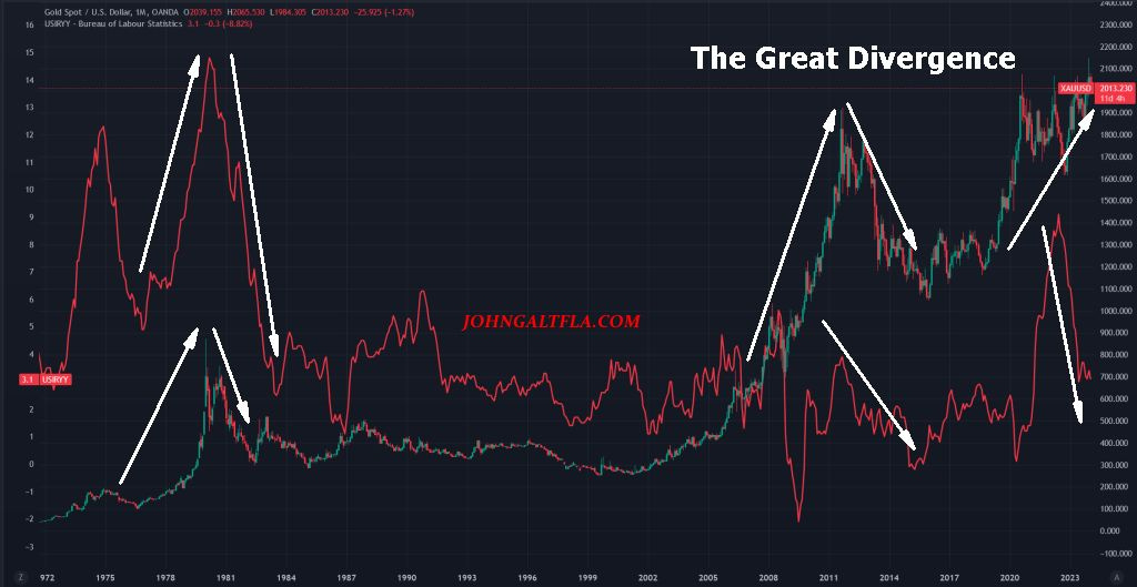 The new dilemma facing Goldbugs is not hyperinflation as of yet, but stagflation. The policies of Jay Powell and the two major political parties over the last twenty years have all but guaranteed this outcome in the past twelve years and the chart I prefer to use to highlight this is “The Great Divergence” where inflation as reported via the BLS, CPI-U versus gold prices.