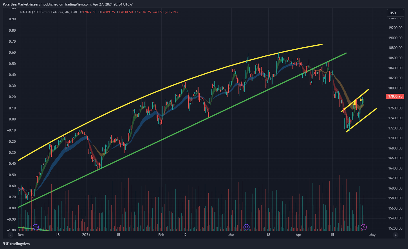 Market conditions remain broadly softer after the face ripper that we saw to start Q1. As highlighted in our Sunday report from last weekend, my bias remains slightly bearish and agile as long as this setup remains on the Nadaq index and (similar charts) are seen across many other indices/names. The markets overextended themselves on hopes of rate cuts and now we’re moving into a combination of softer labor market data and ‘higher inflation’ for longer + rising yields that could spell turbulence ahead in risk assets.