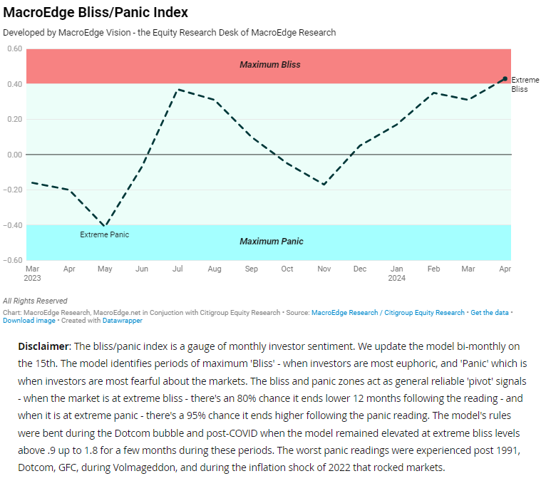 Sentiment remains very euphoric and our Panic/Bliss Gauge remained unchanged on a week/week basis, per the MacroEdge Vision Research Desk (.43):