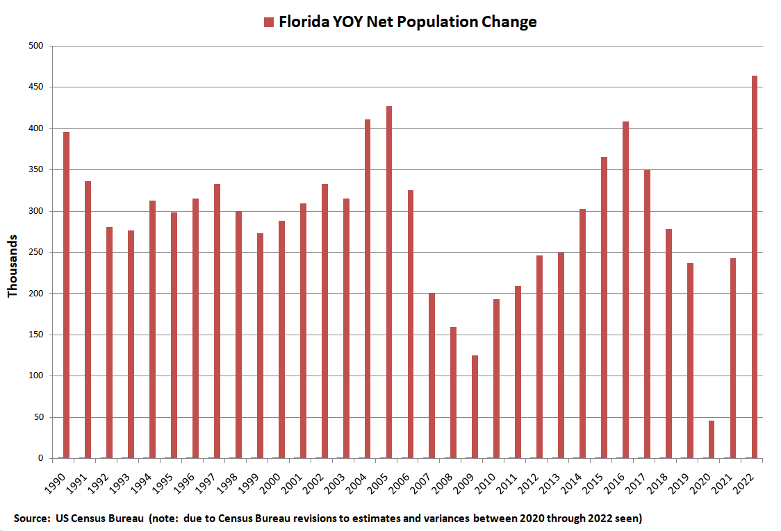 While headlines would lead one to believe that the state is being overwhelmed by the number of new residents flocking to Florida from other states, in reality, Florida has had one of the fastest growing populations for decades. In fact, 2020 had some of the lowest rates of net migration due to the outward international migration during Covid. Since 2000, the average annual net migration into Florida has been 281,000 new residents.