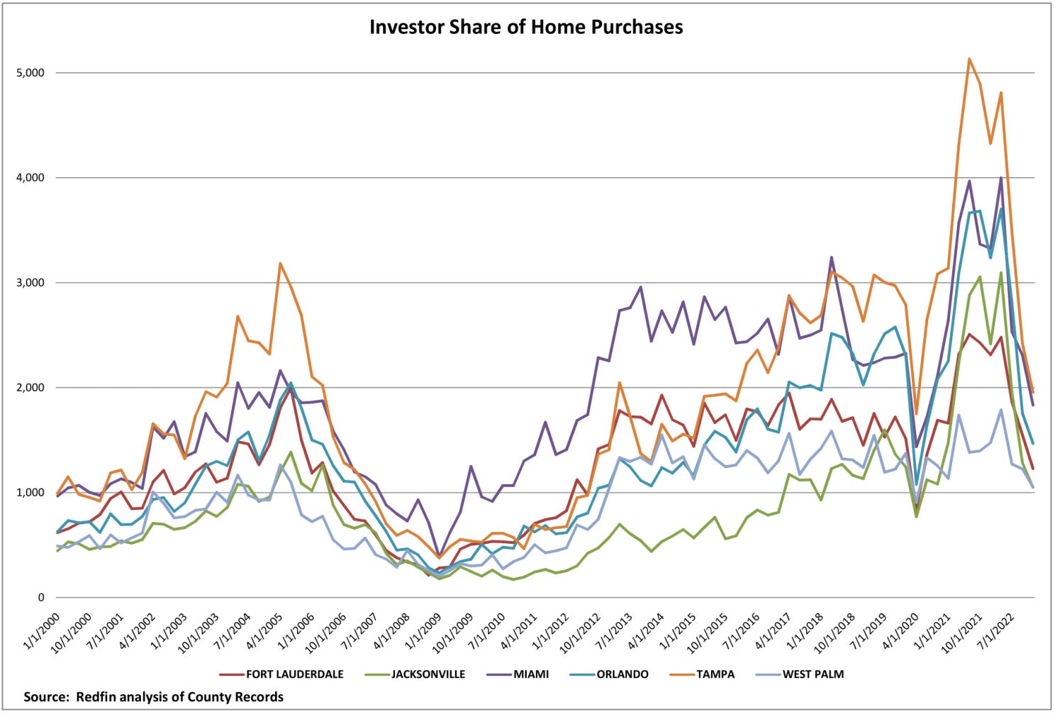 With record low interest rates and quantitative easing, many investors flooded the real estate market seeking yield and many of these investors targeted our Southern State. Data analyzed by Redfin shows the significant surge in investor purchases seen since 2020 in our largest metropolitan markets.