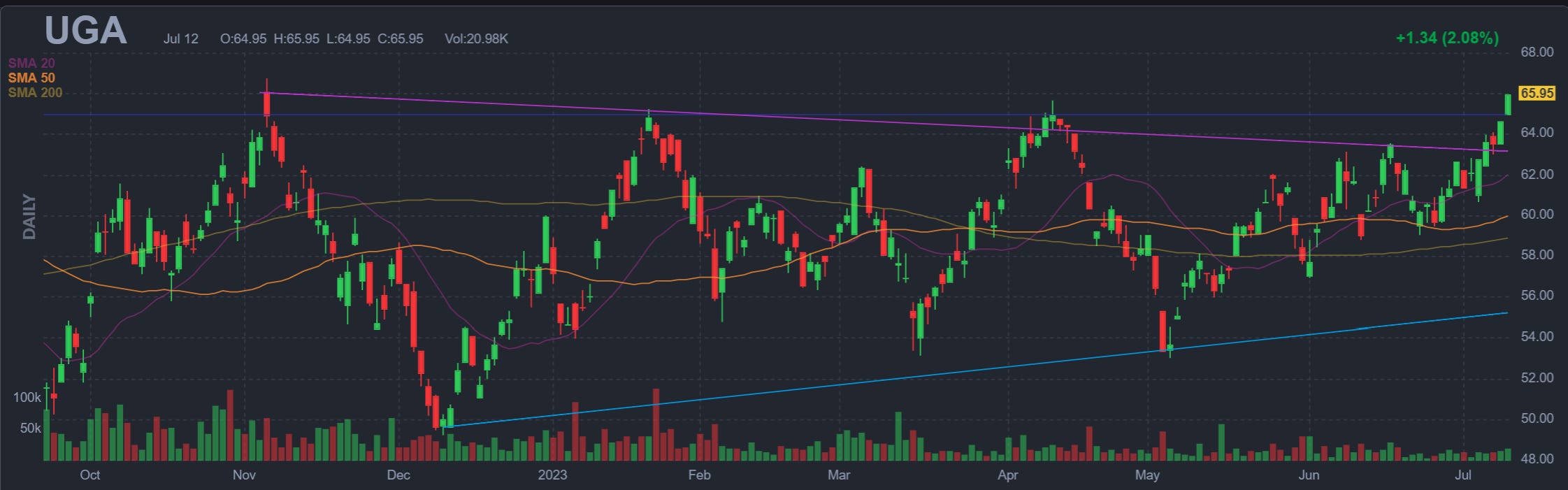 UGA looks great. Sitting right at supply but the short term trend has been higher highs higher lows since may. I would feel good about using this to spec oil and I think I’m going to add some tomorrow. Closed on the exact high of the day. Technically looks really good. It’s coming into contact with top of supply zone with extremely bullish short term technicals. Closed the day on YTD high. Think PTJ would love this ticker. Low volume so liquidity is of some concern.