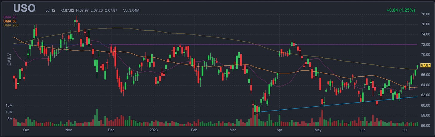 OPEC+ seems to want the floor to be in that high-60s range, likely to stay above that floor in the interim as the economy continues to grind along (albeit, at a slower pace). Jet fuel demand is at a record high, with record short positioning against crude futures, I think consumers have a little more cash than the Fed thinks on the excess savings front. That, coupled with a weaker dollar, is a recipe for a bounce in oil.