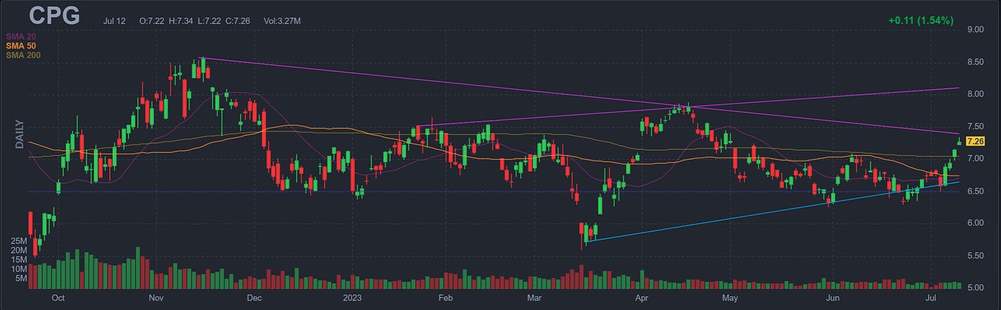 CPG Trading at a 40% discount to book value. EPS is projected to double next year. 3.90 forward P/E. Long term debt on the company decreasing on a yearly basis substantially since 2019. Substantial revenue growth the last few years. This company is one I definitely want to research much more in detail because I like what I’ve seen thus far very much. Next technical level to watch for a response would be this short term level. Stock been mostly rangebound between $6 and $8 for the last 18 months with the exception of a steep bell curve move in June of 2022. I’d say this is a buy and hold here on initial fundamentals. For a trade, I’d take a position here, and add more on a break of this top trendline. For trading purposes, I’d cut the position on a trendline rejection here.