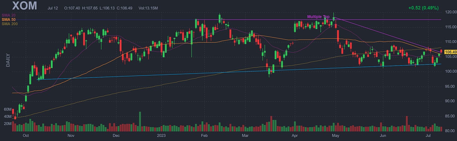 XOM I like it over 100. Could retest 100 to the downside to shake out weak longs and short-term speculators. Ideally, I’d wanna get it off a bounce off 100 but if oil becomes bullish without the SPR drain. EPS consensus 2024 forecast is $9.41 down from $14.77 trailing 12 months. My main concern is this trendline and today’s candle specifically. I like it over the 2014 cyclical top for the stock with bullish oil tailwinds.