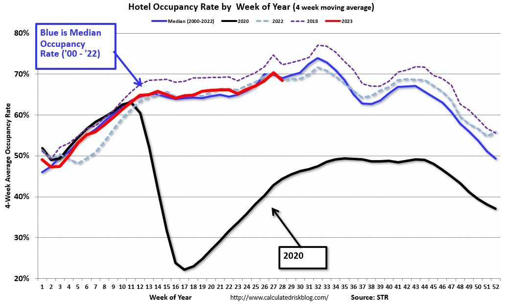This second chart here from Bill highlights a year/year decrease in hotel occupancy rates - although we just saw a higher week/week increase in gas demand coming off the large print from the July 4th weekend.