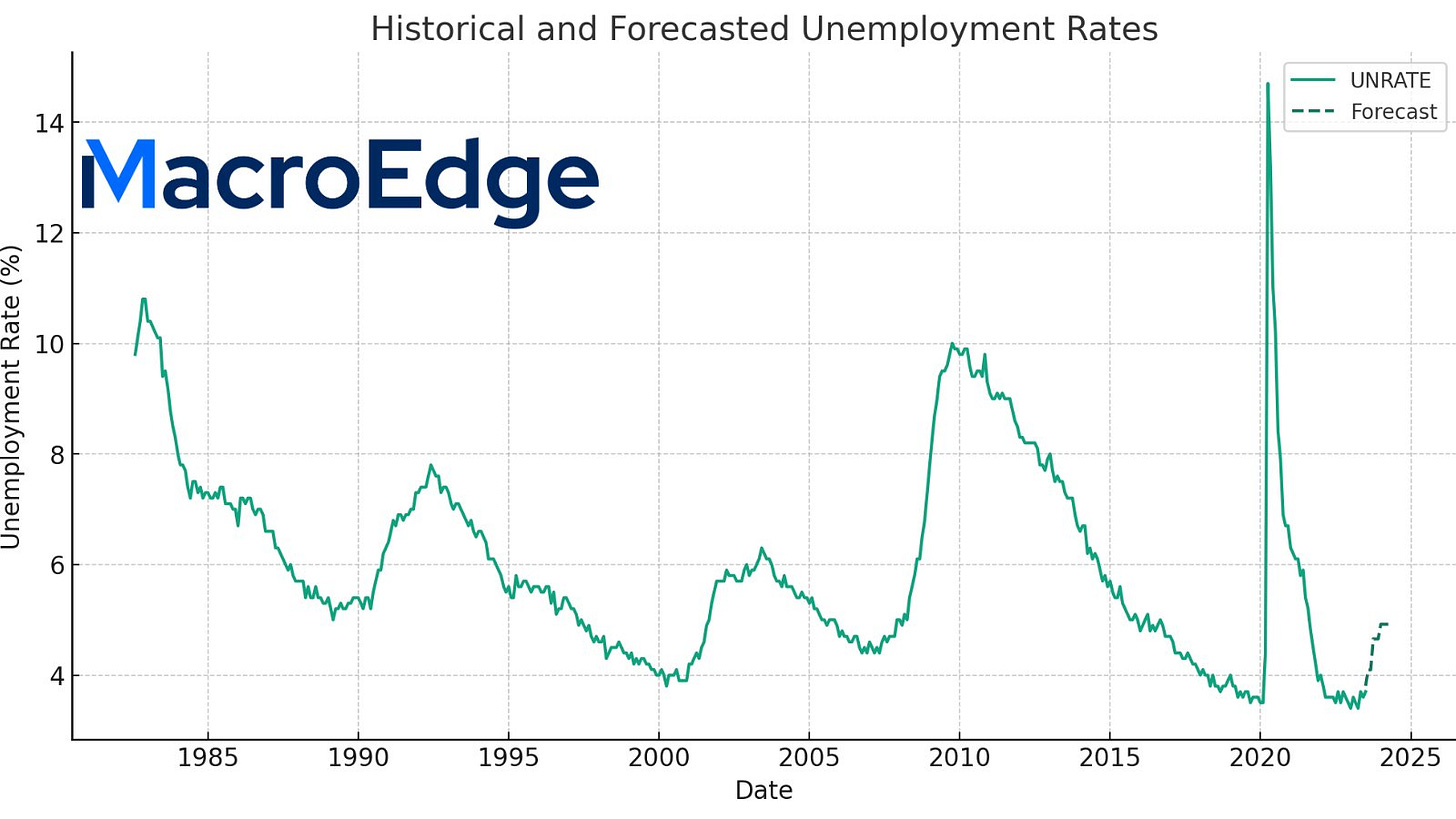 The MacroEdge UNRATE forecast thorough June of 2024 highlights a sharply increasing unemployment rate from current levels up to almost 5% at the end of the second half of next year, highlighting headwinds ahead in the labor markets that are in line with things like sharply decreasing job openings and the Fed continuing its goal of tightening up the labor market dramatically (still their endgame, in our opinion).