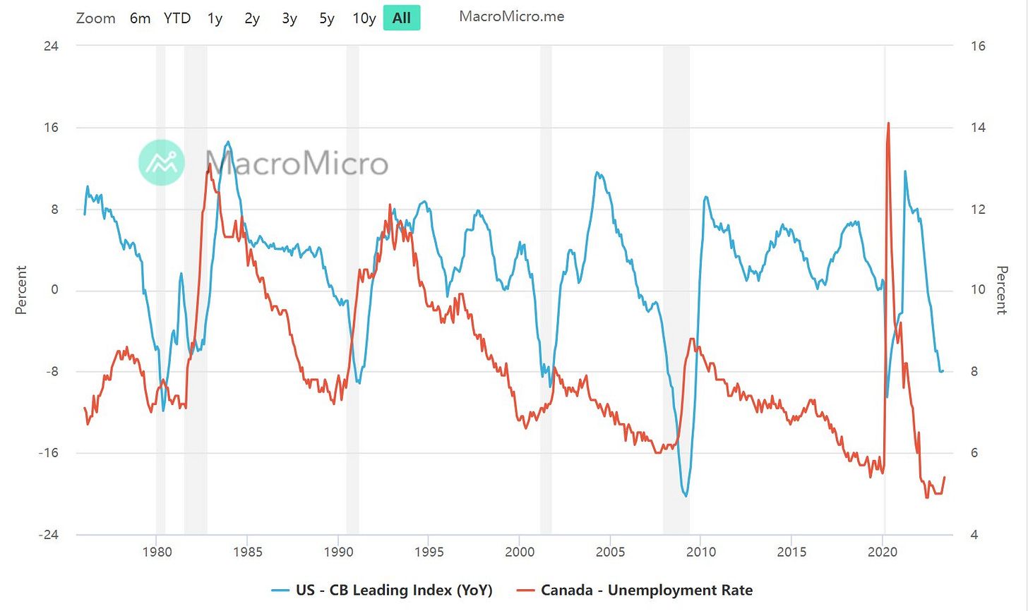 Canada is facing headwinds as well (above) and has seen a larger increase in their unemployment rate already than we’ve seen in the United States. Notice that every time that we see a greater than 8% decrease y/y in the leading index, unemployment rises sharply in Canada - with the smallest example being the increase seen after the tech bubble collapse in the states in 01.