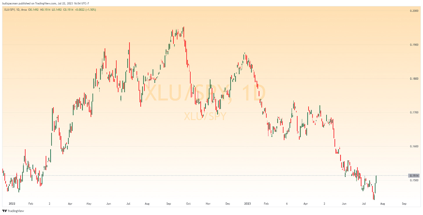 To be very honest, the breakout shown above is very reminiscent of Costco (COST), which spent a year consolidating and is now rallying back towards ATH. Is that what’s in store for XLU? The earnings season should provide some hints. While companies loaded with debt service charges will generally have an unpleasant time the longer we stay in a high-rate environment, there will be opportunities aplenty for those willing to look beneath the surface for unloved gems, starting with NextEra Energy (NEE), set to report on 7/24 this week. Additionally, utilities are now beginning to outperform the S&P 500 as indicated by the chart below.