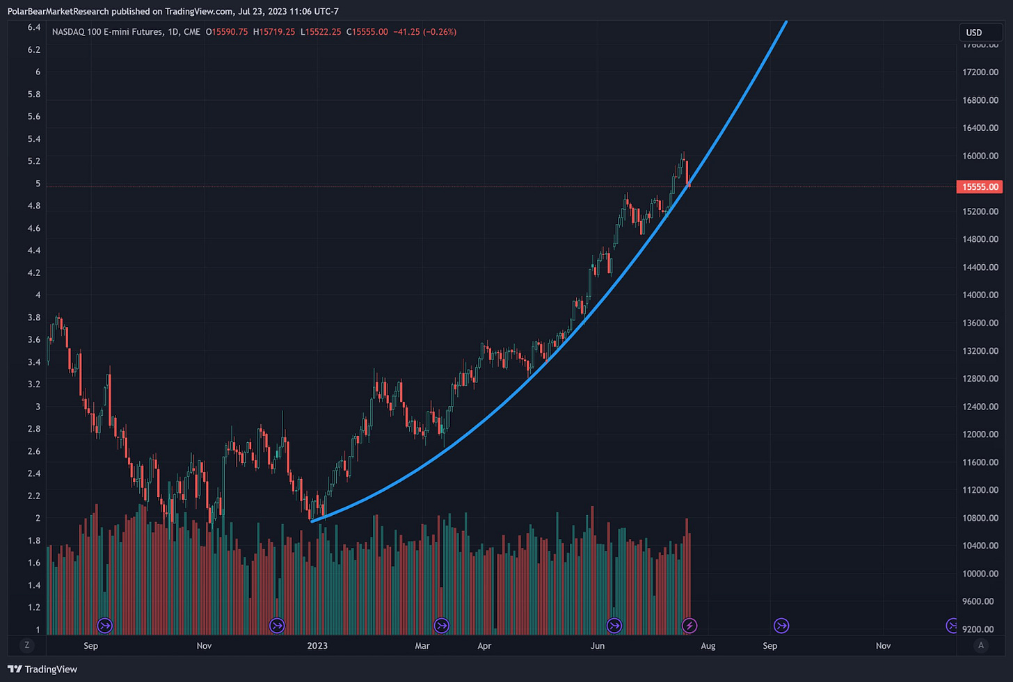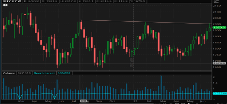 This week we have a jam packed schedule and you can likely expect some volatility, especially in the Nasdaq. Microsoft, Google, report on Tuesday after market close. Wednesday, Meta after the close. Wednesday morning we have new home sales, forecasted at 717k, down from May 763k print. We also Wednesday have FOMC policy rate decision, followed by Powell presser. Forward guidance on rates from Powell will be center stage, as market is pricing in this rate hike being the last of the cycle. Bank of Americas’ fund managers survey is reporting over 68% of managers predicting a soft landing, which is quite early to forecast with the known lag on policy rate on the greatest rate hike velocity in quite some time and M2 money supply decreasing YoY as we have touched on previously.