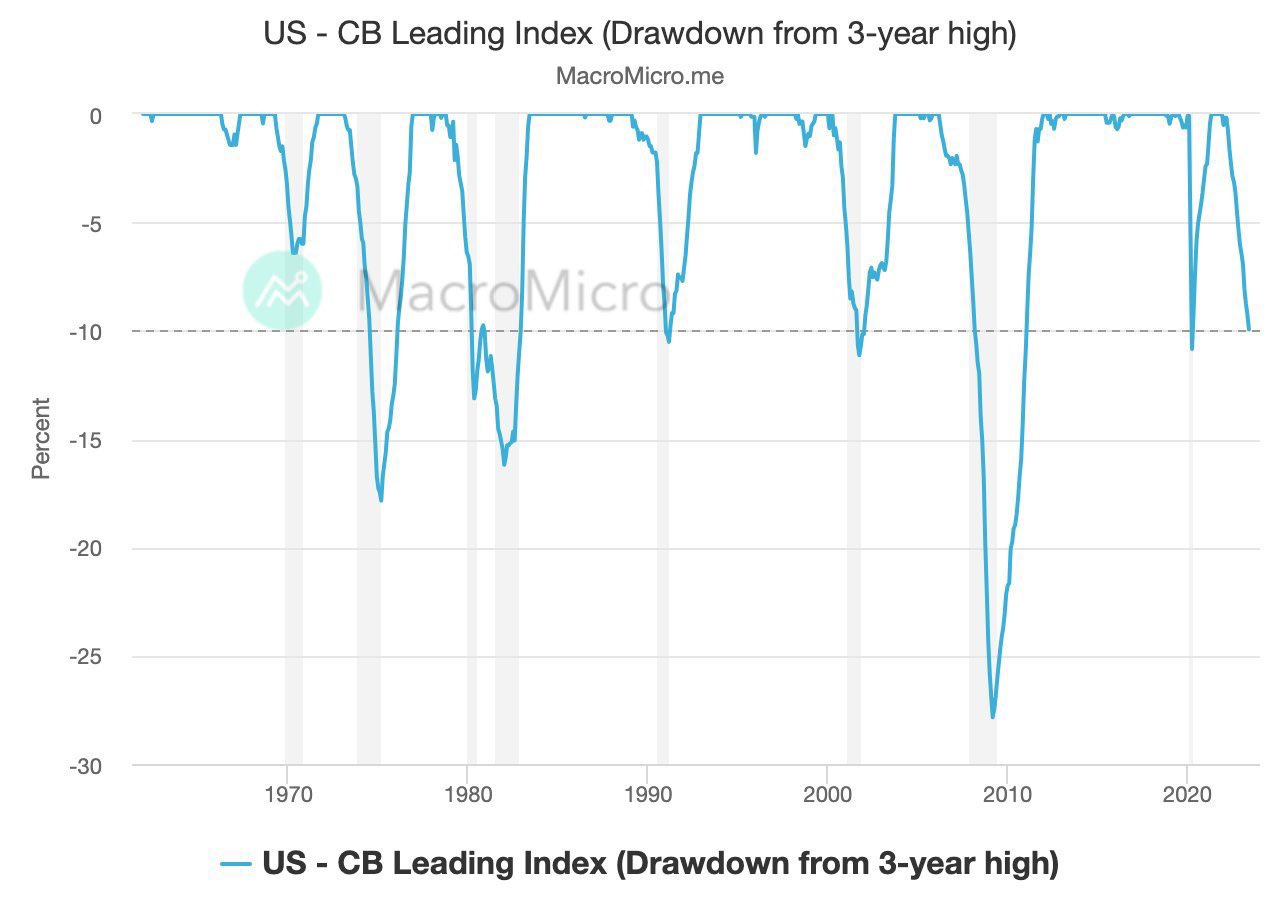 The Conference Board Leading Index is at a level that has occurred before/during the last 8 recessions in the United States. Now seeing economists come up with models to debunk this (yield curve doesn’t matter, new orders who cares, stocks go up!) Expecting further drawdown from here.