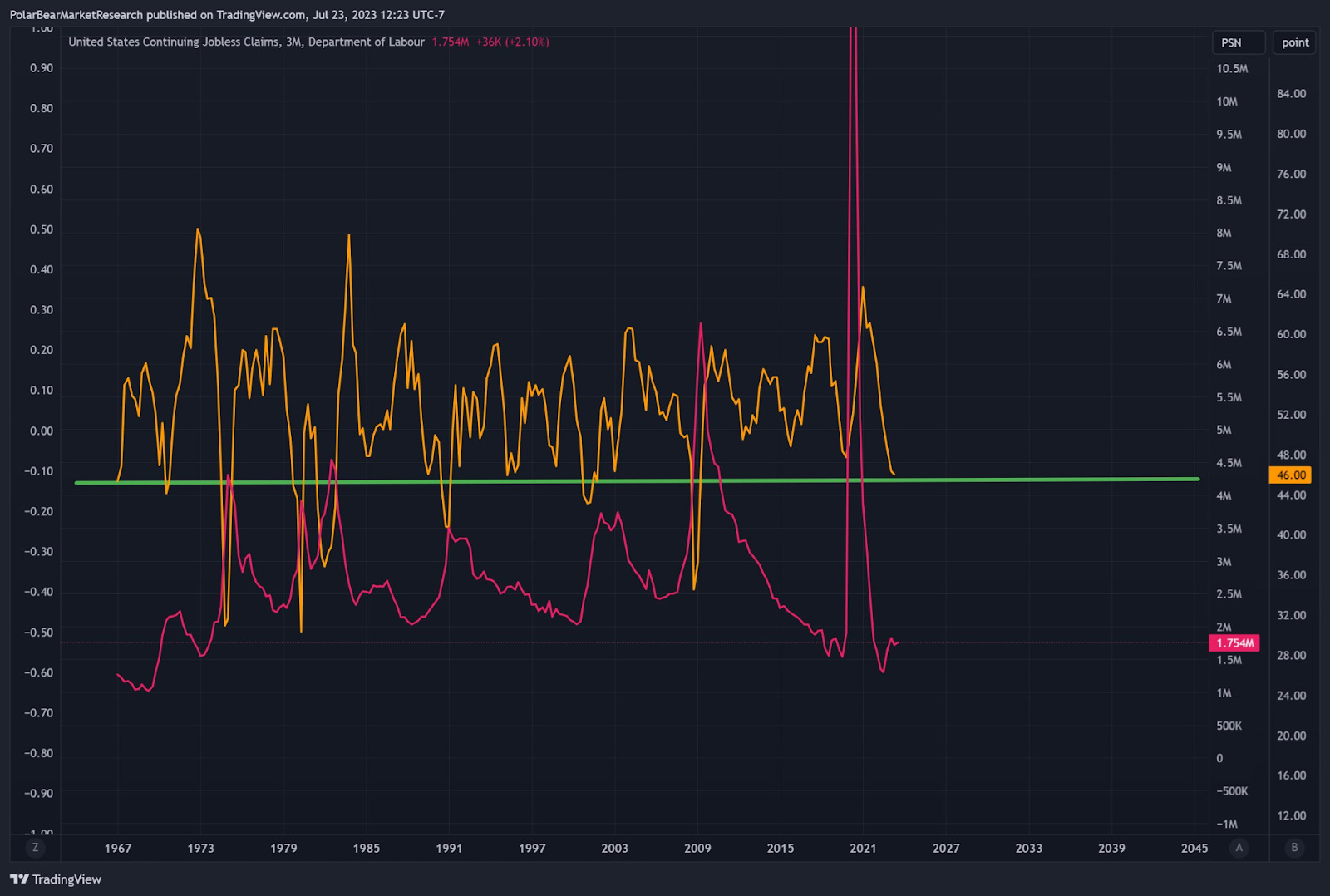 When the manufacturing PMI declines below the 45 level on the index - continuing claims tend to rise very sharply after that point. It's currently sitting at 46.