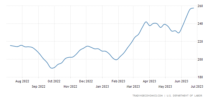 Initial jobless claims taking into account the 4 week moving average jumped to the highest this cycle (calling this cycle the post-COVID reset)