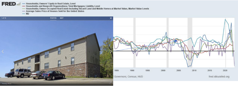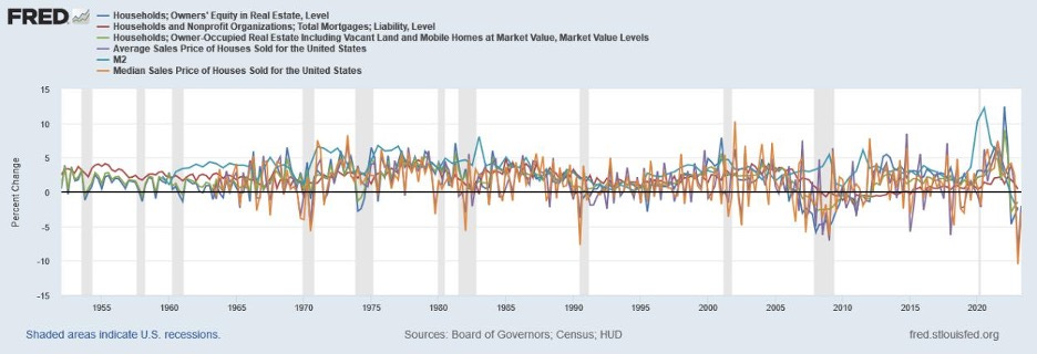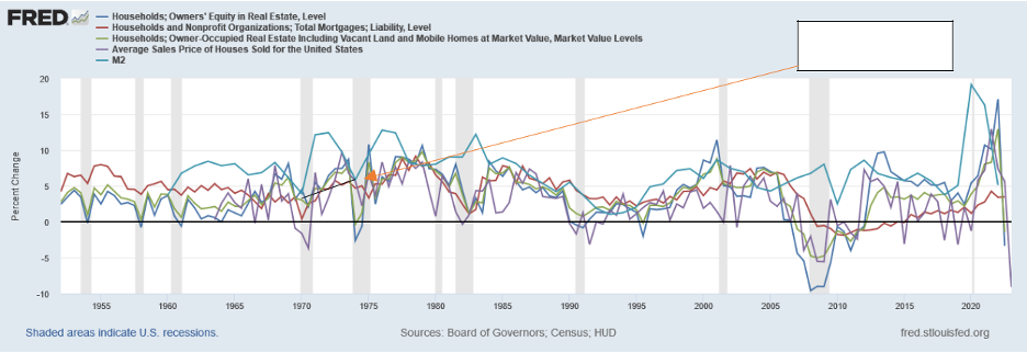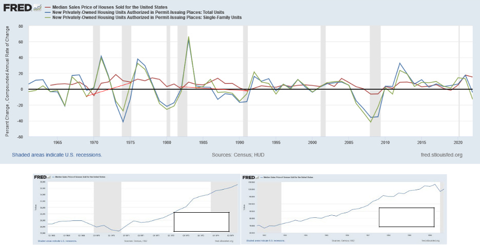 In the graph above, we can compare the rate of change of Equity, Mortgages, Value of Real Estate vs M2 Money supply (everyone does this for money, and none of it works without money, right?). So the blue line floating above all the other bands is the rate of money supply, or “the cycle” of money as relating to real estate. Every spike above that level of M2 is “a bubble”. No cycle or business operates up and to the right at a direct 45-degree march continuously forever. It has multiple factors that contribute to difficulties of “peak” performance. Below, you can see the cycles of permitting for construction. I added red lines so you can see the shape of the cycle. In 1970 we see there was a huge effort “construction starts” (cycle start) with a peak in sales price (Peak) of the cycle towards the end of the cycle despite inflation, it was a very normal-looking cycle. Compared to the 1983 cycle start of construction, the sales price peaked “late” but the return was spread out more evenly between all years. Below that is the “volume” of dollar change to the median sales prices from 1970-1975 on the left, and 1982-1990 on the right.