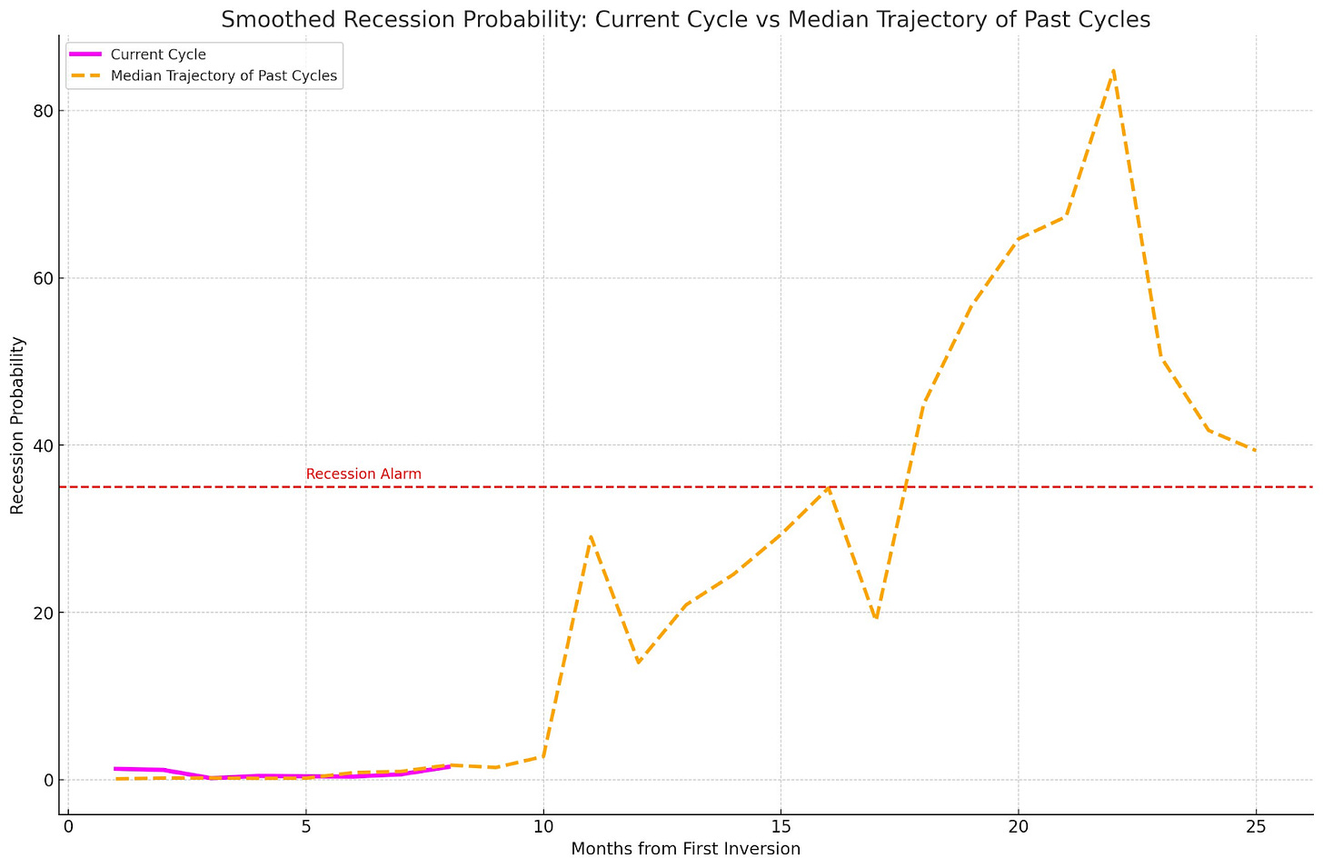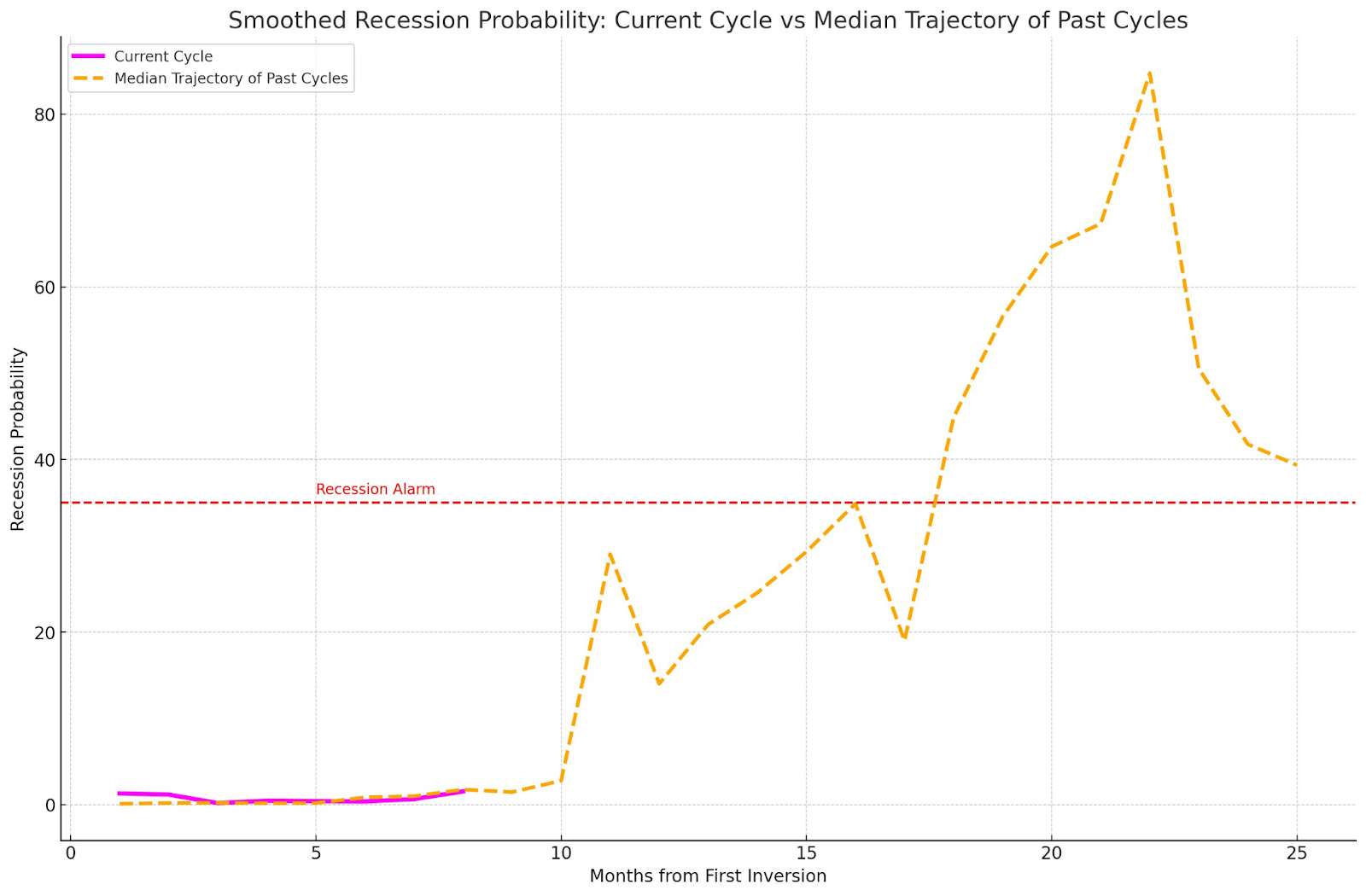Now let’s dive into the charts and data. Here’s Chauvet, Marcelle; Piger, & Max's smoothed recession probability model. Utilizing the median trajectory of past cycles since 1969 - we can see that this current cycle is running a very typical track of when we would start to see this indicator begin trending up towards the ‘recession alarm’ threshold at .35 on the y-axis, and this is another helpful model that we can utilize in the context of the many other models that we’ve been tracking in order to analyze the actual lag effects from this neck-snapping hiking cycle taking effect.