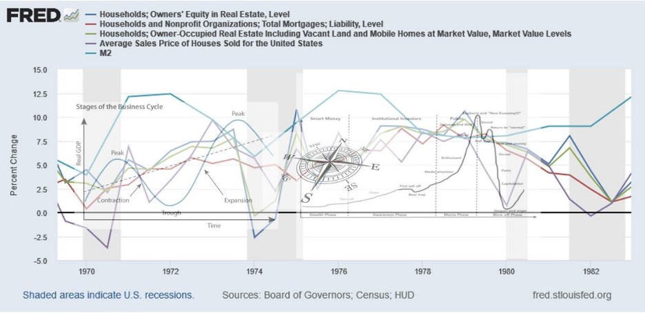 Let's begin somewhere in modern times. Real estate, as all businesses are cyclical. This mocked-up graph above shows real rates of change, along with these two well-known graphics: