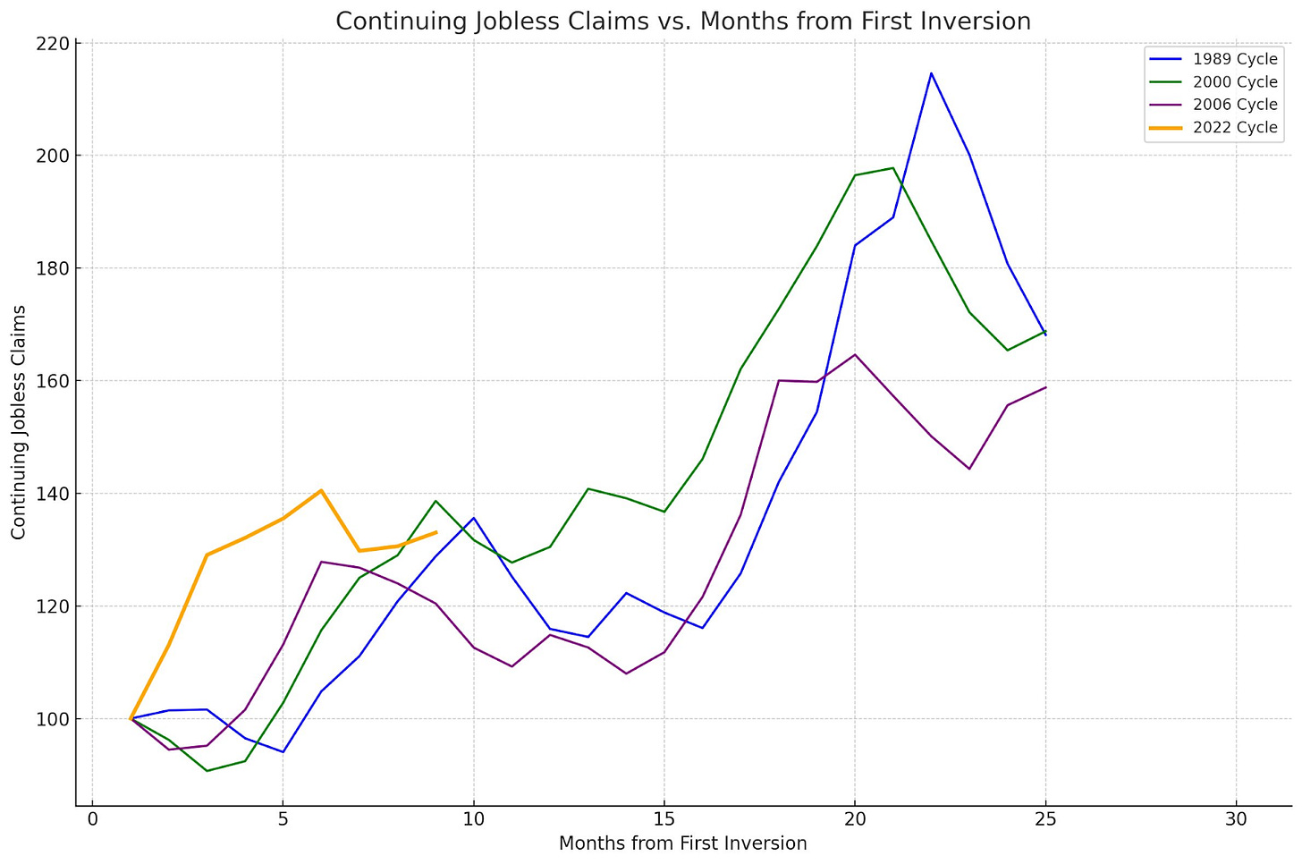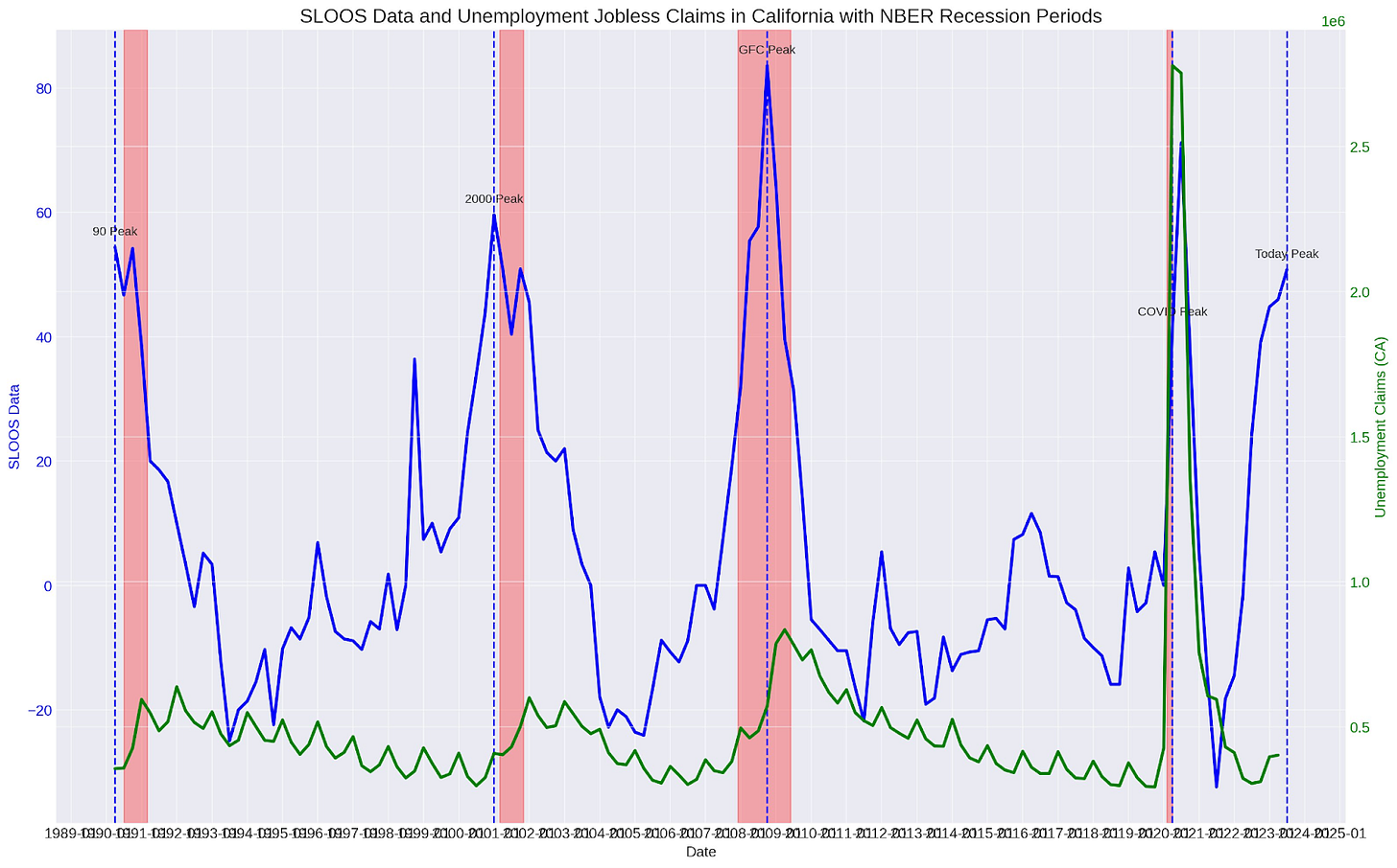 As we can see - going back to the 1990 recession, continuing claims tends to see its largest increases after the peak net % tightening reported by bankers.