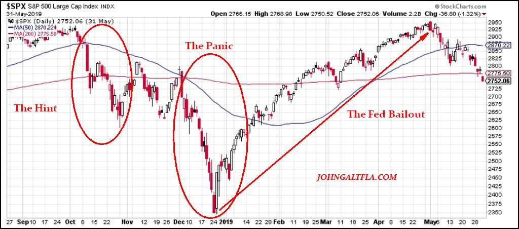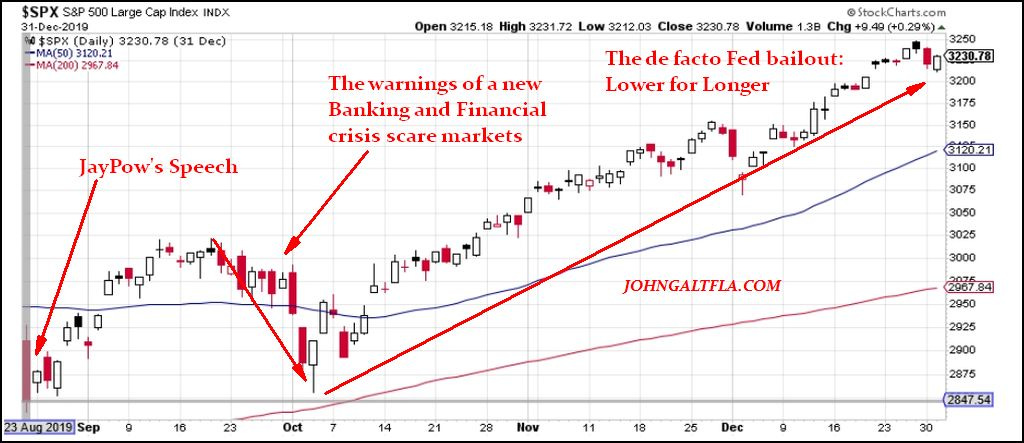 Unfortunately for Chair Powell, his predecessors failed to tell him about the lurking financial crisis in the banking system which was simply postponed from 2009 and serviced by the taxpayer. In October of 2018, just two months after the speech, equity markets caught a whiff of this problem and in December began to liquidate positions in anticipation of a 2019 financial crisis.