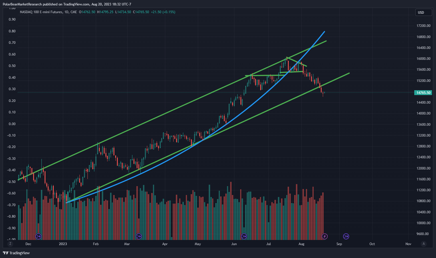 Right now we’re in this historical lull period where we may begin to see the ‘long and variable lag’ take effect in things like labor data and industrial production. Things are still running strong in the economy - but we aren’t seeing these huge celebrations after earnings like we were in Spring/Early Summer on the run up. The Nasdaq index lost that channel we titled ‘Valhalla’ months ago: