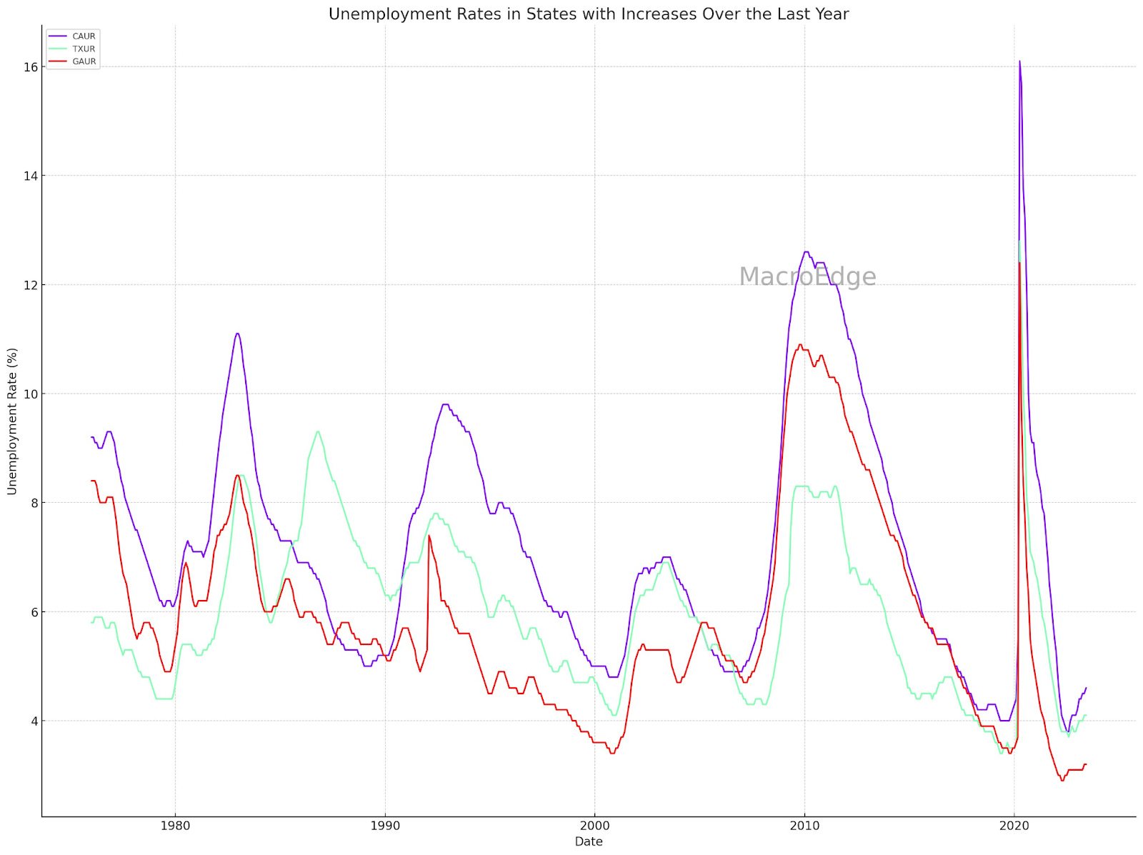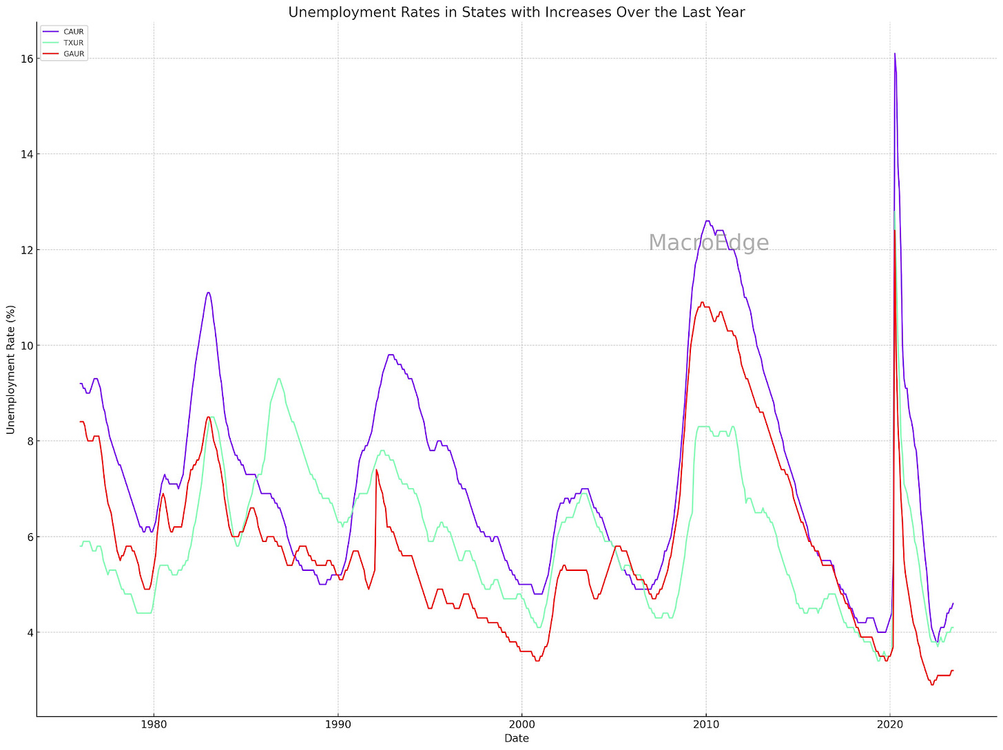 CA (purple), TX (green), GA (red), unemployment rates
