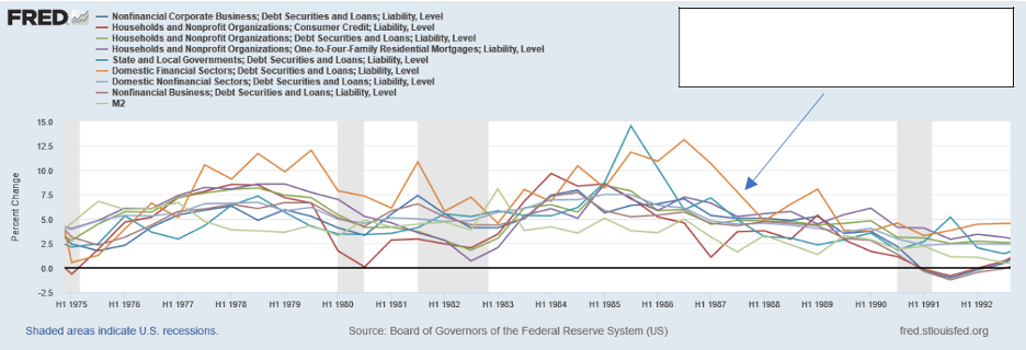 Speaking of 1987: The green “spike” at Q1 1987 is commercial real estate mortgage asset level.