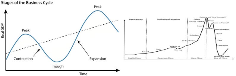 What sets the bubble areas apart from the rest of the cycle? A couple of things. First, a fundamental misunderstanding of business cycles, and that recession is both natural and necessary. You output energy/capital, then you need to recuperate for the next output. Recessions don’t have to be completely deflationary, as we’ve proven. Second: Debt, and a fundamental misunderstanding of debt. If you plan on your investment being worth more in the future, but don't plan for the increased costs including debt associated with it, then as the kids say you're NGMI.