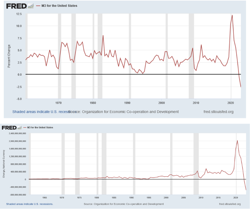 Notice how every rate of change increase getting closer to M2 deceleration, we see the change of pace of the federal funds effective rate increase to encase the “bubble” or peak of rate change increase. There's an attempt to stave off the increasing rate or encapsulate bubbles. In reality, the federal funds rate of change needed to encapsulate rate of change increases in 2021, not 2022. And 2003, not 2004. And 1986, not 1987. Another note: At no other time in this timeline has M2 rate of change continued to decrease into negative territory. In fact, here's a look at M3 money supplies rate of change and dollar change: