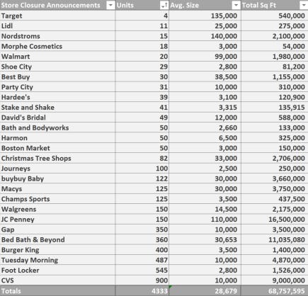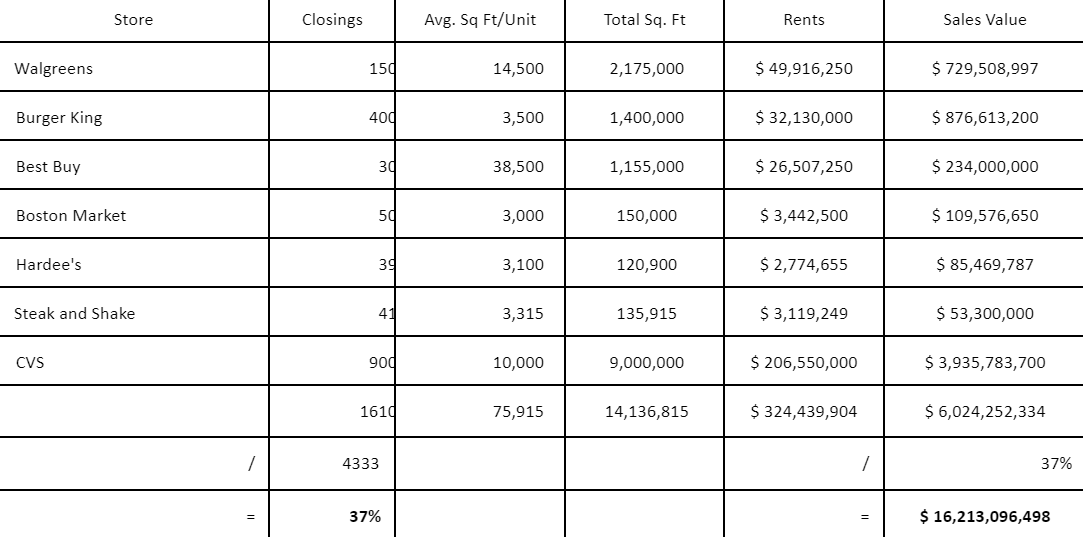 That's 68+ million square feet of retail space that will stop producing revenue this year, using the average store footprint. Using average U.S. retail rent calculations, that's $1.5 billion in rents that won't be paid next year. While some stores only rent spaces, like inside shopping malls (Champs Sports/Foot Locker), others anchor them (Macy's/JC Penney). There's a large subset of these that sell their stores and lease them back, like Rite Aid, Walgreens, and Burger King. Doing an analysis of brands that develop their stores to sell as NNN (Triple Net Lease) or sale/leaseback paints a startling picture.