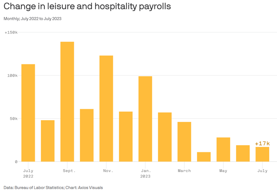 The hiring patterns reflect the broader slowdown. Data from the Bureau of Labor Statistics reveals a tapering in hiring within the leisure and hospitality sector. From an average of 81,000 job gains each month in Q4 2022, the momentum has slowed to just 19,000 in Q2 2023.