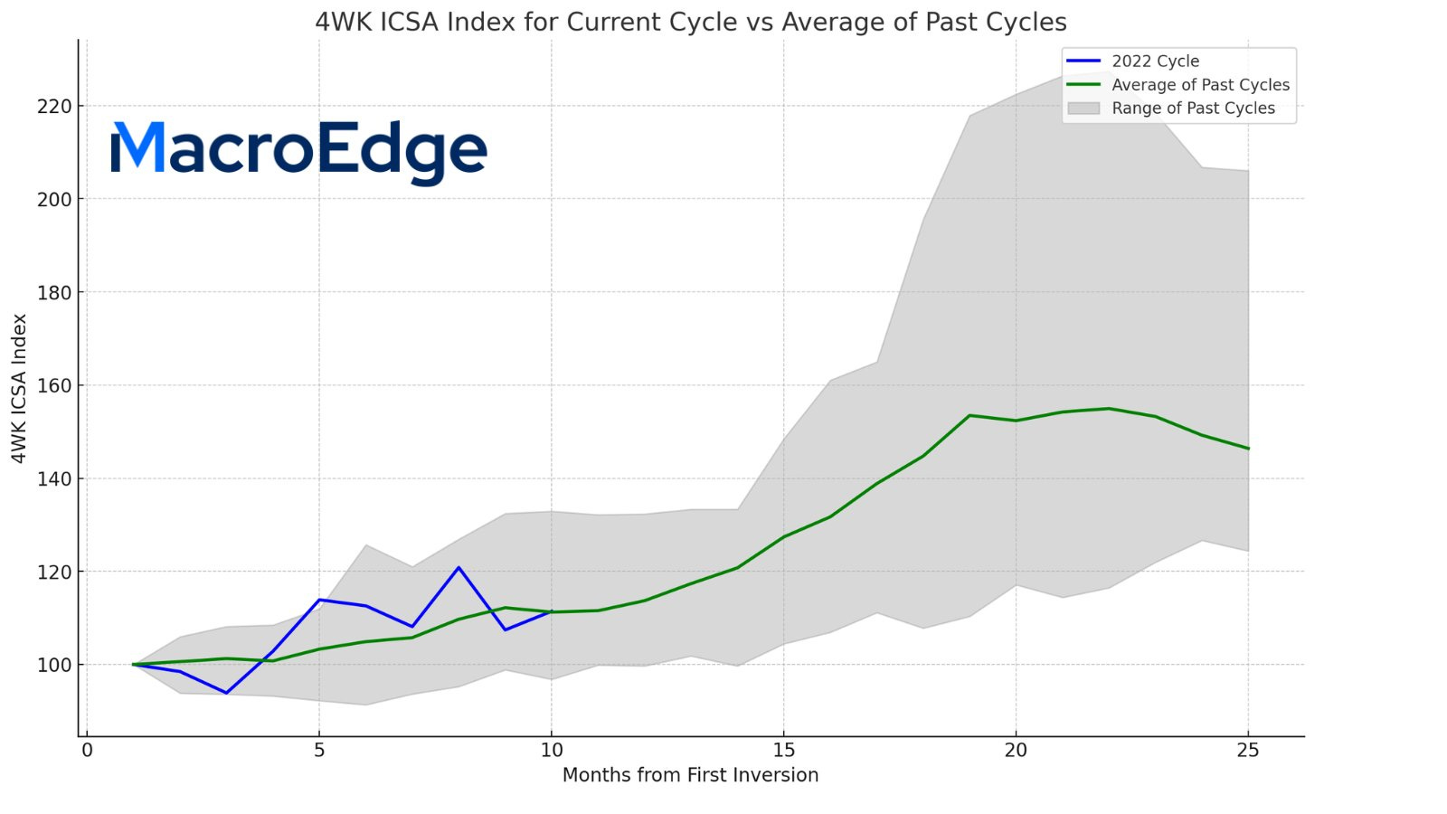Our current initial claims scenario continues to echo past cycles - progressing right above/on the average trendline of the past cycles (dating back to 1969). Notice that most deterioration happens between months 13-18 based on past cycles, which at month 10 currently would be months away. This chart will be included on the MacroEdge data dashboard and I will update it next week when we have the final 4 week average that includes this last week of August data coming up.