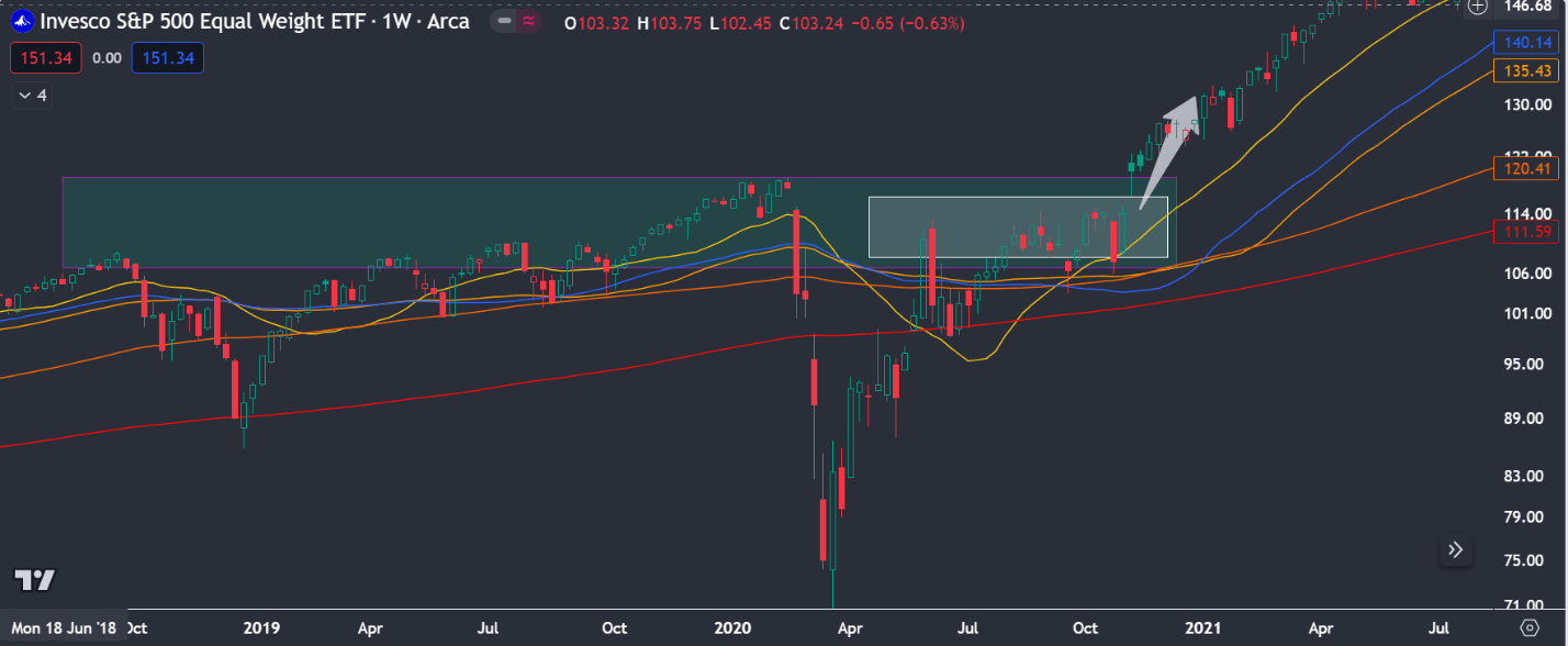 It’s possible we are in some type of consolidation period like 2019, where the average stock underperformed the heaviest-weighted large-cap stocks for over a year. After the March 2020 crash, we quickly found ourselves right back in the consolidation zone before breaking out of the 2-year range at the end of 2020 and the real market gains took place.