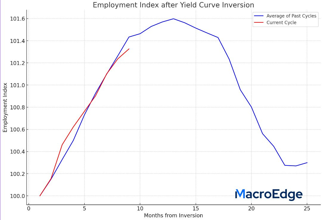 With the downward revised jobs data again next month - we may be seeing slower job growth than the average of past recessionary cycles (or as I call, late stage cycles) - and employment is always very, very, slow to the party. If we compare our current Employment Index to all previous cycles - this is where we stand: