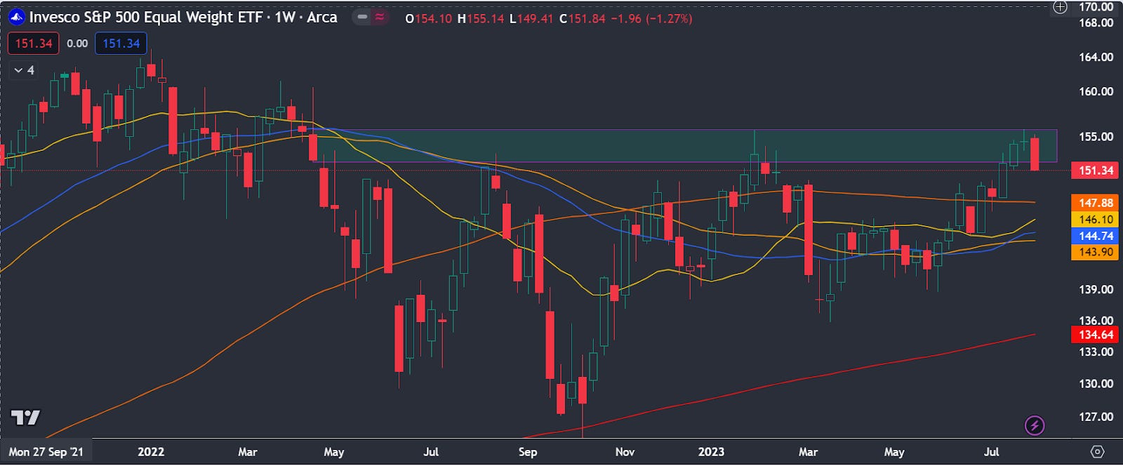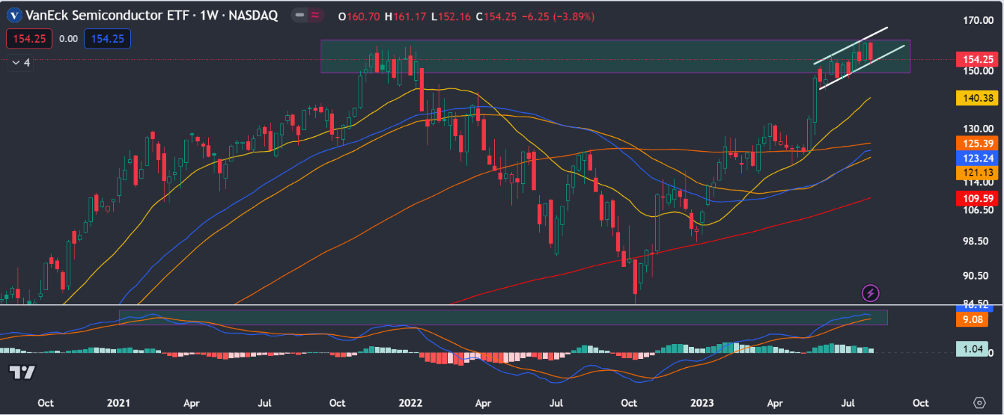With a well-defined market pause over the last several weeks, we are left wondering what else is in store heading into the more seasonally weak periods of the year. Sectors like semiconductors tracked by the $SMH have found some resistance back at their 2021 highs. Here we see a potential double top in price and momentum around this $160 level. Semis have been riding the AI wave in 2023 and have been almost immune to market weakness until the last several weeks. But their relative underperformance in the last few months has been noted.
