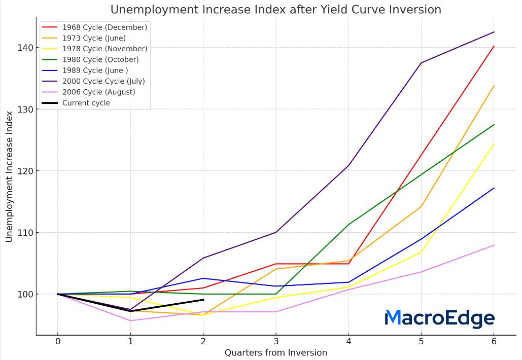 There hasn’t been a hard landing since 1968 that has seen unemployment lower a year (4 quarters) following inversion. 2006 and 1978 were two notable cycles that saw decreases in the baseline unemployment rate all the way until quarter 4 - when they ended up being higher than the baseline. This is something that I am watching carefully as Q3/4 progress.