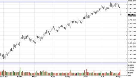 NVDA will report its earnings on August 22nd with an expected EPS of 2.07. The way the market digests Nvidia earnings will be very telling about the near and medium-term equities forecast, in my opinion. As previously touched on, NVDA ignited the torch of AI that spurred much of this YTD rally in equities. (NVDA -442 bps past 5 days)