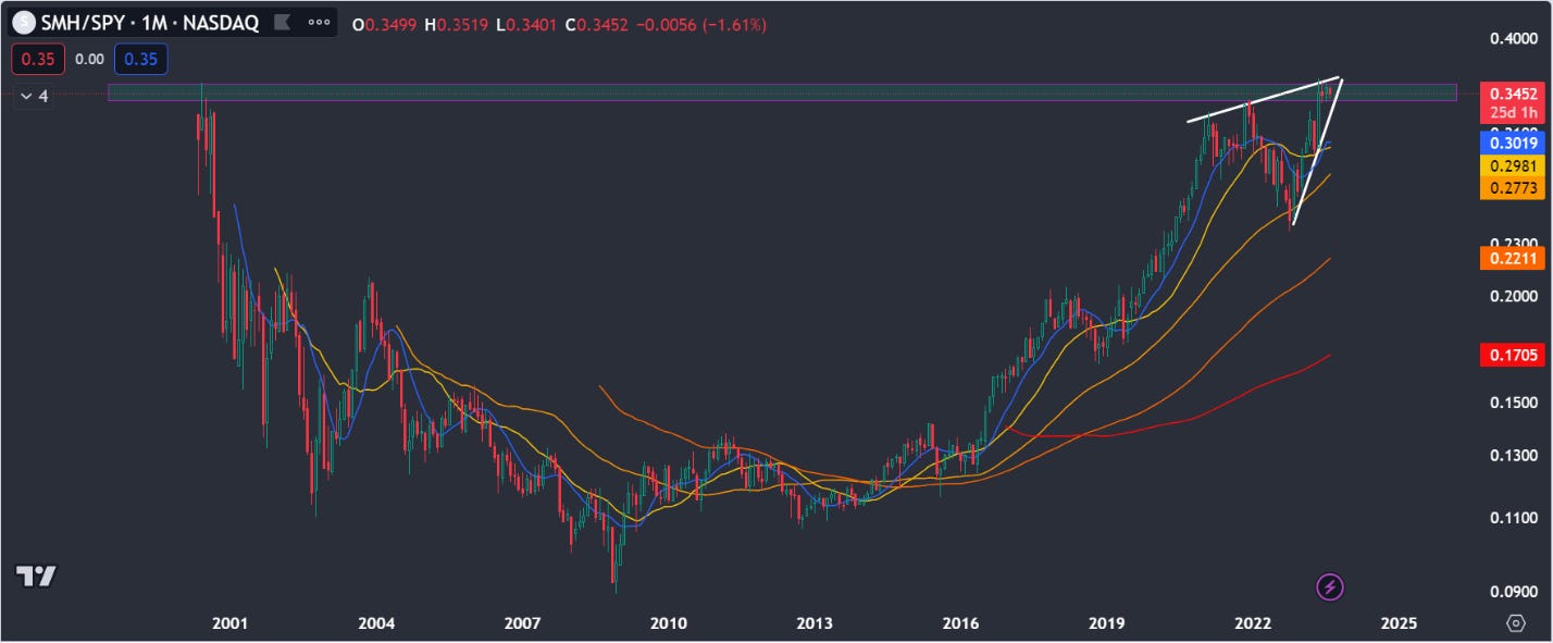 The $SMH relative to the $SPY, ALSO has made a double top dating all the way back to the Dot Com bubble. This alongside a roll over in strength could show a sign investor are cautious on the more outperformance of the $SMH, which has already doubled from the October 2022 lows.