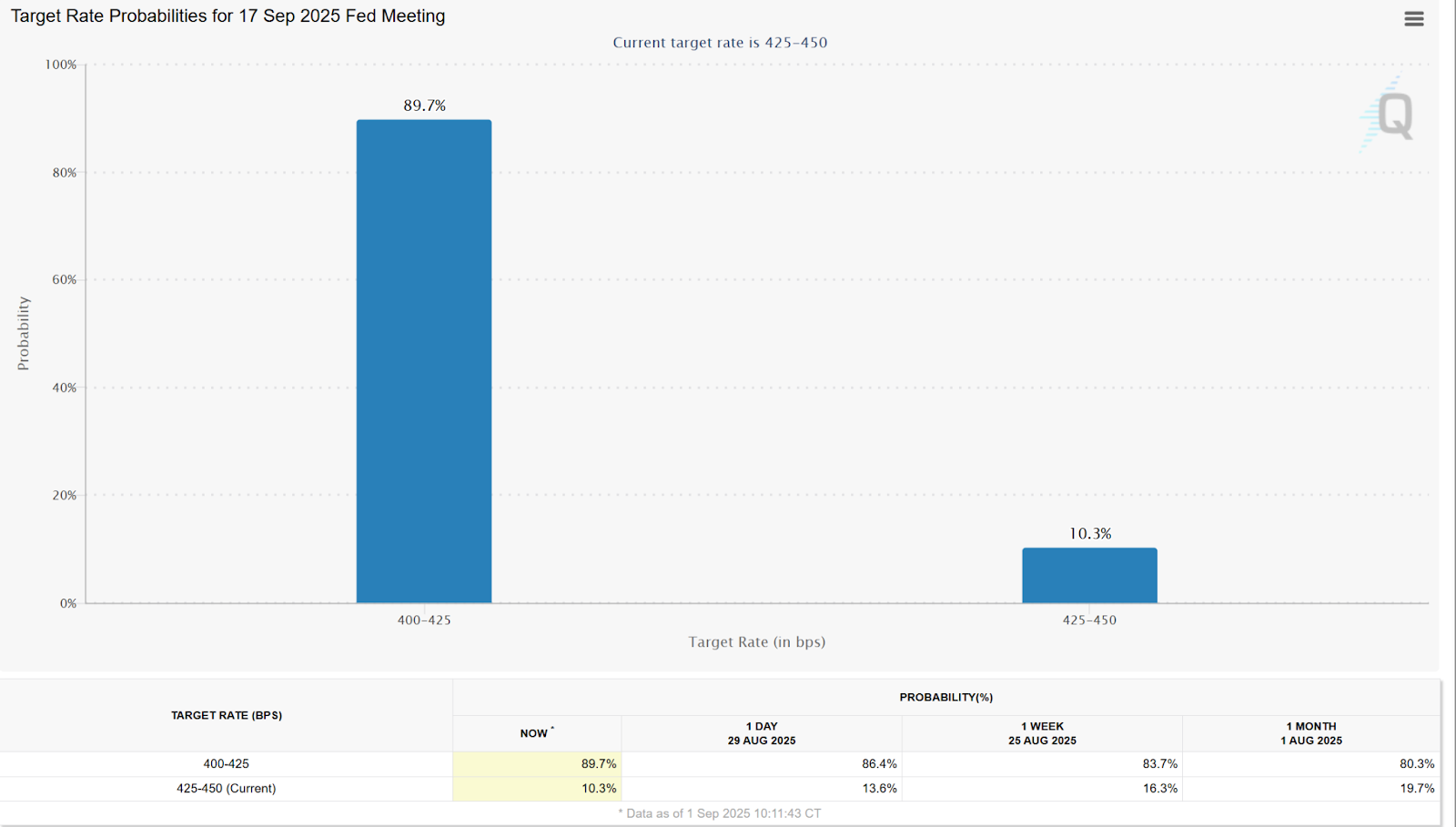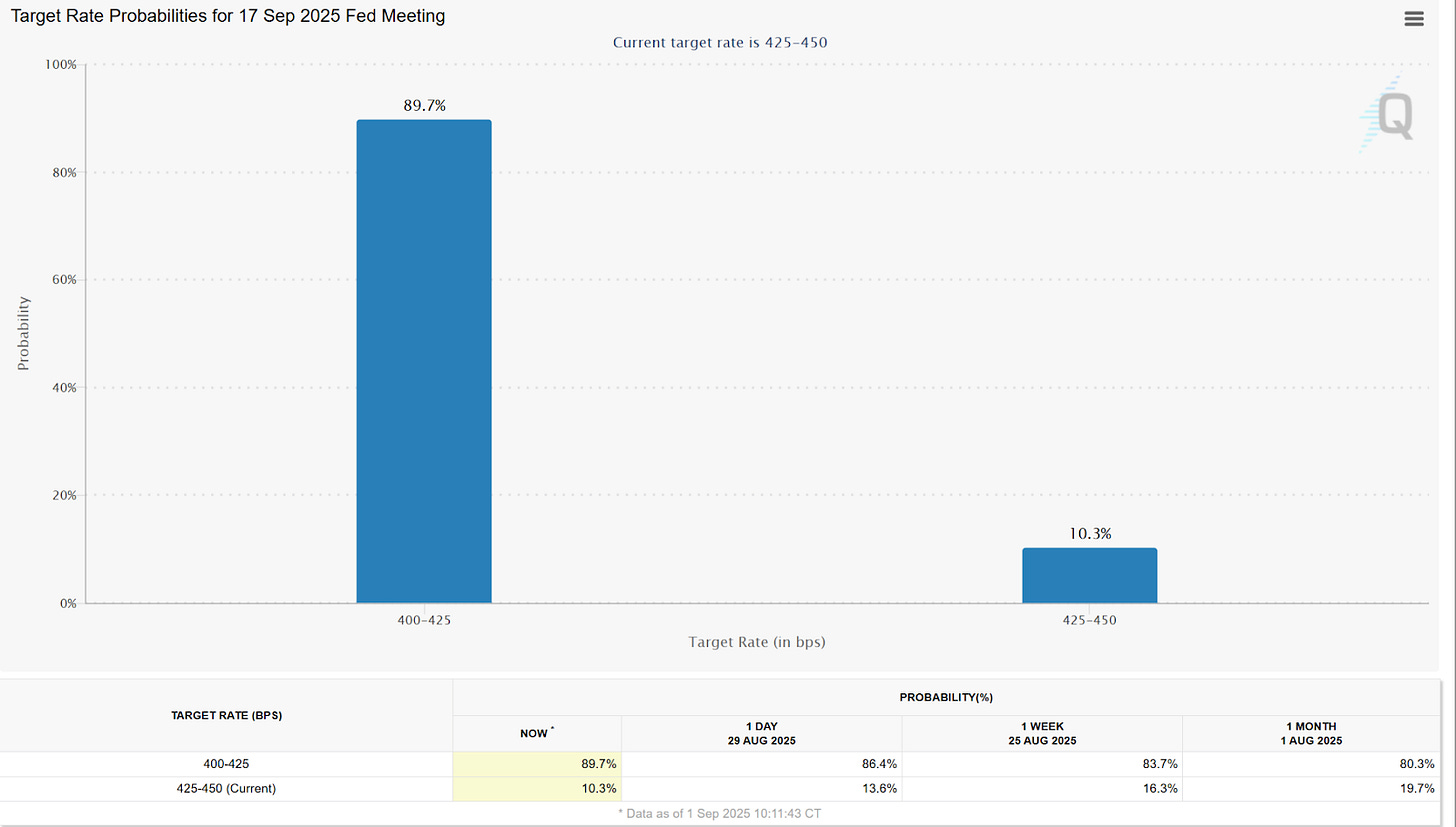 The September cut is now an almost certain outcome - with odds pegging a 25bp cut near 90%.