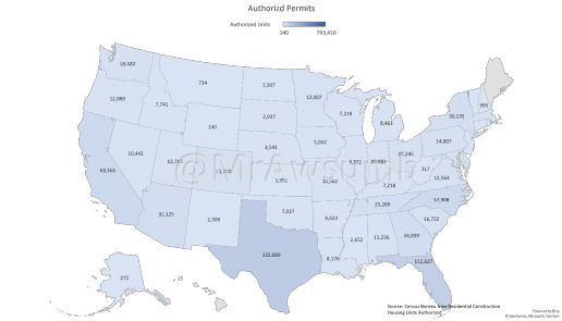 This is a map I created using Census Bureau data as of August 2023. This is an accurate depiction of all 793,271 authorized housing permits in the United States.