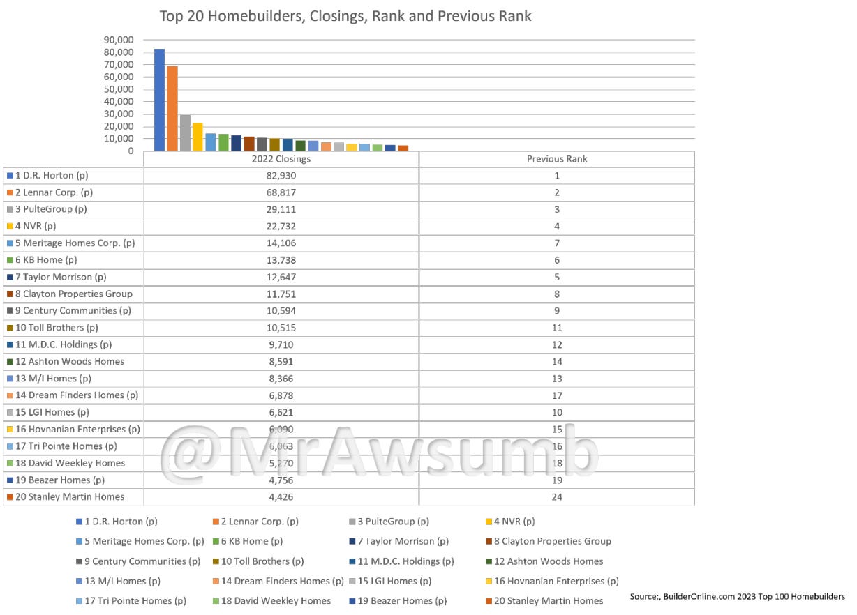 Here are the top 20 Builders from last year. I actually compared all permits for sale this year to the sales volume of the top 200 last year and spread it equally based on last year’s market share. For example, DR Horton makes up 16.85% of the entire homebuilder market. Now, the business has winners and losers, so I am positive this last chart I put together will be wrong simply because I distributed these permits equally. Just look at the top 20 here, with the current rank and the previous year’s rank. Some builders will fare better than others: