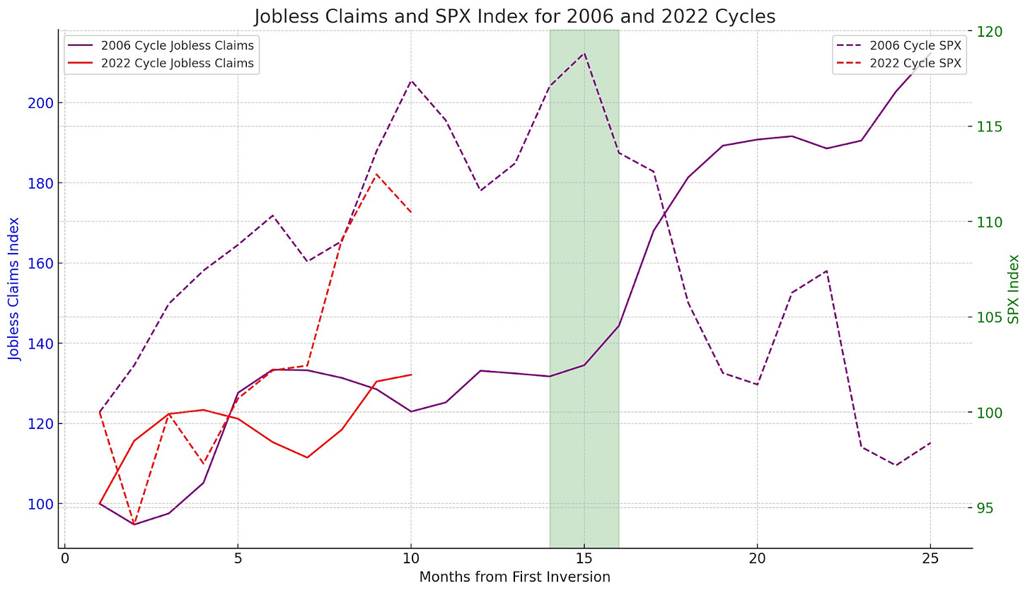 You can couple this with a number of different features like the Glassdoor employee survey highlighting plummeting employee sentiment about the condition their employer is in (and many others). During the highlighted period on the chart (the peak soft landing window) ranging from now (10.5 months from inversion) to approx 15 months from inversion we may see claims tick up slowly or even flatline. The sound from soft landers will become deafening as they claim victory - as they did in 2006, 2000, and many other times.