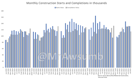 Of those, as of July, 437,000 of those permits were “For Sale” builds according to the most recent Census Bureau New Construction Survey. Now, what if we wanted to evaluate how publicly traded homebuilders are doing? Fortunately for us, The Census also tracks construction starts, completions, and sales.