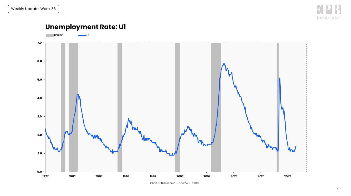 One of the most shocking is the “Las Vegas Wins Big” which was released just 3.5 months before “Recession-Proof Las Vegas hit by US economic downturn” - highlighting how public sentiment about a recession doesn’t really flip until the labor component flips. While this data focuses particularly on claims - claims (both initial and continuing) have remained elevated to historical pre-recessionary cycle levels even though they have cooled off in recent weeks. If you break it down to city by city levels - you can find places like Las Vegas where claims are continuing to track higher, and states like CA where unemployment is up sharply off of the bottom. Eric of EPB Research mentioned the U-1 unemployment rate (>15 weeks) which is another strong indicator of the softening labor market…