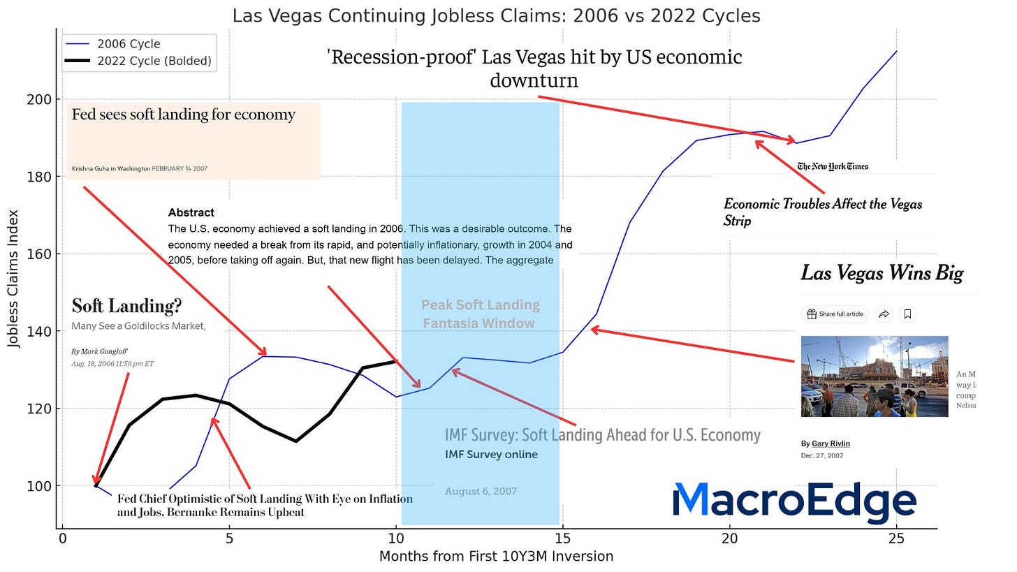 I’ll kick us off this weekend with a chart I crafted while watching some Saturday College Football focusing on the labor lag… Many on Twitter continue to mention that the bear case is dead and the Fed has already achieved a 94/19 style ‘soft-landing’ - I disagree sharply on this point. On the graph I crafted below - you can view the 2006 continuing jobless claims index for Vegas and articles released during that time period highlighting how rosy things were during this time period: